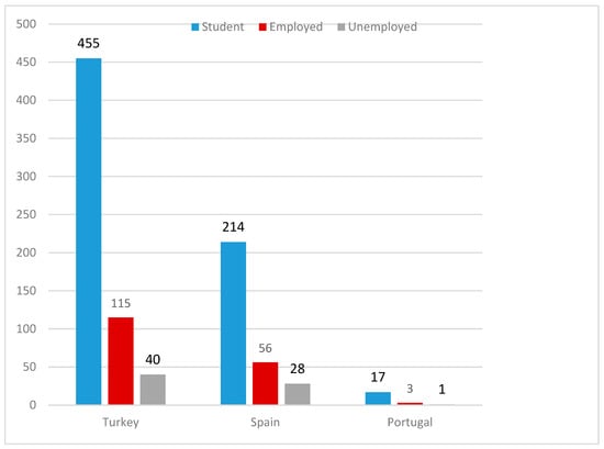Figure 6 and Table 1 show that 455 respondents are students, 115 respondents have a job, and 40 respondents are unemployed in Turkey. In Spain, 214 respondents are students, 56 respondents have a job and 28 people are unemployed. In Portugal, 17 respondents are students, 3 respondents have a job, and 1 respondent is unemployed. A total of 90.1% of those in employment have a full-time job. In addition, 74% of participants employed report that their job is a graduate job.