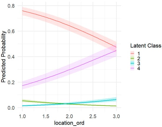 Figure 1 considers the effect of location in the national spatial hierarchy (rural to large cities) on class membership probabilities. Once again, Class 1—Digitally Conservative Backbone—dominates at the rural end of the spectrum with over 70% but declines dramatically with increasing urbanization to fall into virtual equality with Class 4 in urban settings. Class 4—Focused Digital Integrators—on the other hand, has a unique rising gradient, becoming increasingly likely in large cities, where its predicted probability comes close to or exceeds that of Class 1. The shift suggests that urban areas offer a more favorable infrastructure or institutional setting for SMEs adopting focused digital integration strategies.