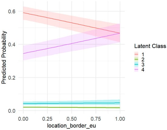 Figure 2 examines the effects of EU border closeness on the likelihood of an SME belonging to each of the digitalization classes. Firms in Class 1—Digitally Conservative Backbone—exhibit a declining predicted probability of occurrence as the proximity to EU borders increases. Although they are dominant in non-border firms (with over 60% predicted probability), their share drops progressively and dips below 50% in regions close to EU borders.