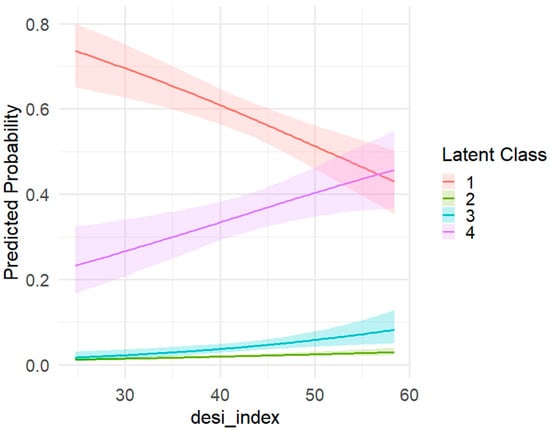 Figure 3 shows the impacts of the DESI index—a composite measure of country-level digital preparedness and infrastructure—on the probability of SMEs to belong to each latent class of digitalization. There is a clear and reversed trend for Class 1 (Digitally Conservative Backbone). Within low-DESI countries, this class is highly concentrated with values near 75%, but it declines steadily as national digital readiness increases. Its predicted probability according to the highest DESI also scores drops below 50%, indicating a displacement effect in more digitally advanced environments. Most heartening is the trajectory for Class 4 (Focused Digital Integrators), whose membership is forecast to rise steeply along the DESI axis. This class begins at around 25% among low-DESI countries and rises towards 50% in the most advanced environments, which implies that improved national digital contexts promote more focused and systematic forms of digital uptake. Class 3 (Digitally Advanced and Diversified) has a limited but notable increase, as well, particularly in the top half of the DESI band. This is due to the likelihood that SMEs at the technological frontier require enabling environments, such as infrastructure, policy and support systems. At the same time, Class 2 (Partially Digital and Upgrading) enterprises are largely static and low throughout the DESI index. This indicates that their challenges are most likely internal or industry-specific, rather than based on national-level digital circumstances.
