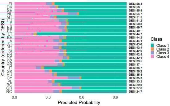 Figure 4 plots the predicted probability of SME class membership for European countries ranked by their national DESI scores. The plot shows that those countries with the highest DESI values, for example, Finland, Denmark, Sweden and the Netherlands, are dominated by Digitally Conservative Backbone SMEs in Class 1. While all these countries have the most advanced level of digital infrastructure overall, the majority of companies there remain behind in terms of how they utilize cutting-edge DT. What this means is that high levels of national digital readiness may or may not translate to high digital sophistication among SMEs. Moving down the DESI continuum, there is a perceivable shift in the digital class composition. Mid-ranking DESI nations, like France, Italy, Slovenia and Portugal, feature more prominently in Class 4 (Focused Digital Integrators). These SMEs possess better-structured yet selective digitalization strategies—reliant on cloud computing, robotics and smart devices but with constraints limiting full-range technological adoption.