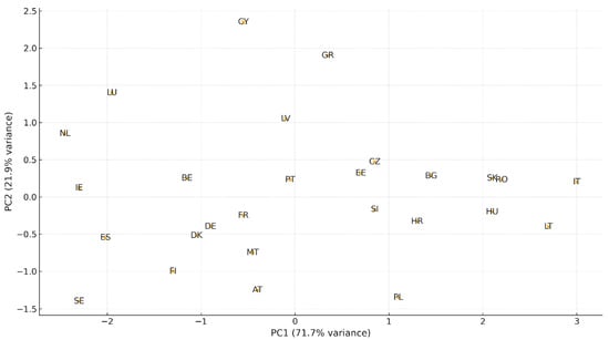 Figure 5 graphs the result of a Principal Component Analysis (PCA) of EU countries against the organization of their SMEs in four latent digitalization classes. The first principal component (PC1), explaining 71.7% of variance, captures the dominant axis of variation in terms of countries’ digitalization organization. The second component (PC2) accounts for an additional 21.9%, making it feasible to plot it in two dimensions that represent over 93% of the total variation in class distributions. On the left of the PC1 axis, Sweden (SE), Finland (FI), Denmark (DK) and the Netherlands (NL) are characterized by SME dominance in Class 1—Digitally Conservative Backbone—with relatively uniform digital strategies and lower levels of advanced or diversified digital adoption at the SME level. These countries are grouped very close together, indicating a shared national pattern where the majority of enterprises rely on core digitalization irrespective of otherwise solid national infrastructure. By contrast, on the right side of the PC1 axis, Poland (PL), Italy (IT), Romania (RO) and Slovakia (SK) have greater SME class structure diversity and higher values for Class 3—Digitally Advanced and Diversified—and Class 4—Focused Digital Integrators. This shift is an increase in a diversified digital landscape where different firm segments follow distinctive digitalization paths, possibly because of unbalanced structural conditions or sector specializations.