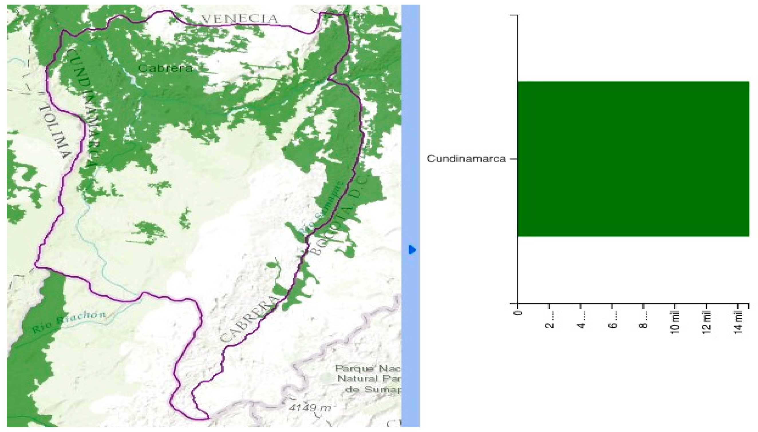 Cabrera is located in the southern province of Sumapaz, Cundinamarca, at coordinates 3°58′41″ N, 74°29′09″ W, with altitudes between 1800 and 2400 m.a.s.l., with a mean annual temperature of 15–22 °C, annual precipitation exceeding 1000 mm and an agroclimatic setting classified as montane humid forest [50,51]. According to data from the Integrated Agricultural Planning System (SIPRA) of UPRA, Cabrera has an agricultural frontier of approximately 14,385 ha, as illustrated in Figure 2.