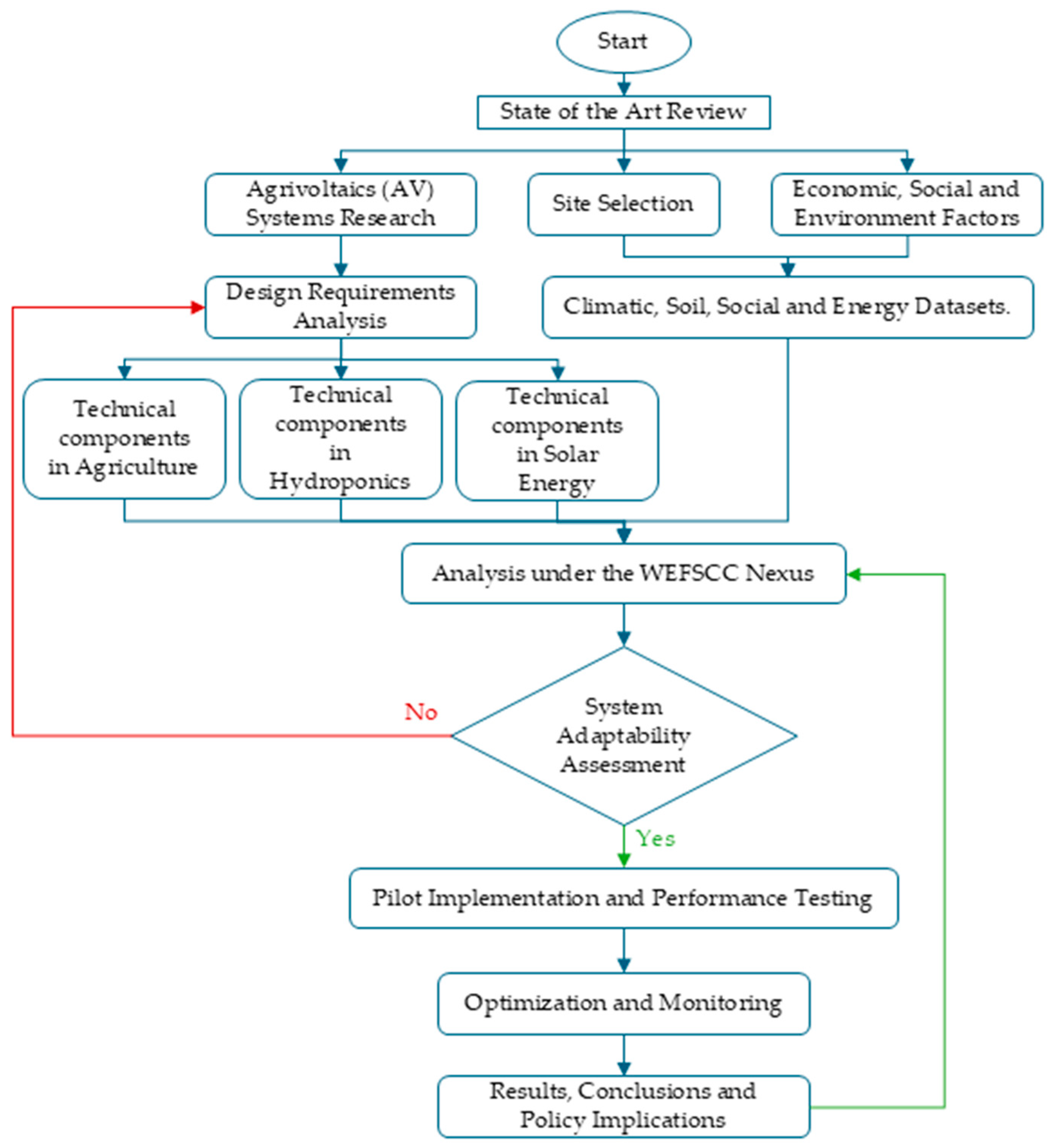 This integrated approach combines technical modeling, environmental assessment, and socio-economic interpretation, ensuring coherence between physical processes and governance outcomes. The methodological design was structured within the Water–Energy–Food–Soil–Climate–Communities (WEFSCC) nexus to evaluate agrivoltaic (AV) systems as holistic instruments for sustainable land management in post-conflict regions. This framework is supported by previous studies that demonstrate the effectiveness of AV systems in articulating resource flows under conditions of aridity and land-use pressure [13,16,35], as well as their capacity to enhance socio-ecological resilience in rural environments [58]. The overall methodological workflow from knowledge synthesis and conceptual design to subsystem modeling, integration, and system assessment, is summarized in Figure 3, which illustrates the sequence from data collection to the integration of results and the evaluation of system adaptability.