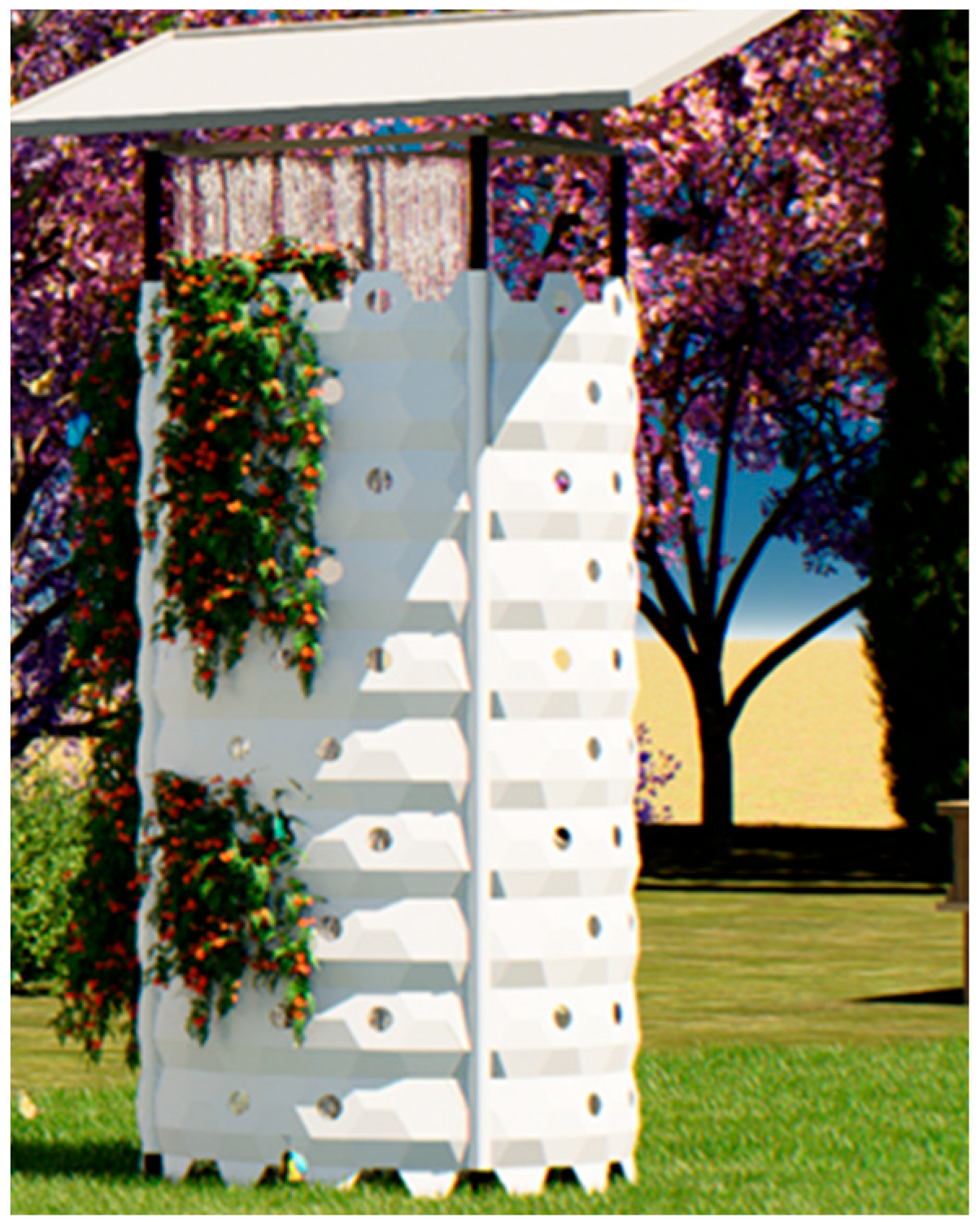 For the agricultural system, five-level hydroponic towers of the NFT type (Nutrient Film Technique) were employed, with a recirculating nutrient solution, submersible pump of 1.5 hp, and pH and EC controllers. Such configurations have been shown to increase water-use efficiency by up to 60% compared to traditional agriculture [41,61]. Each tower level contains 20 planting holes, reaching a cultivation density of approximately 100 plants/m2. In total, 43 towers were installed in Pisba and Cabrera.