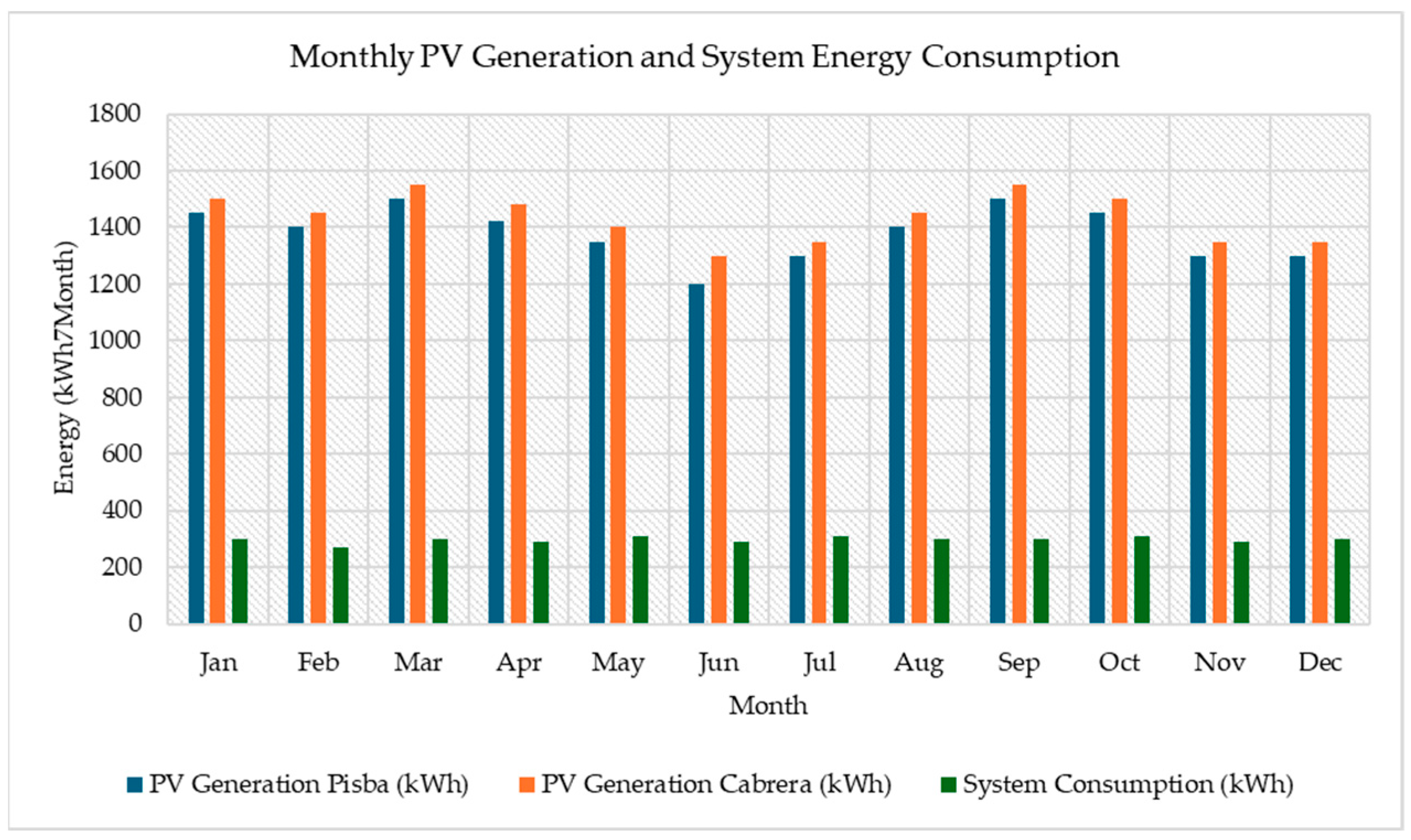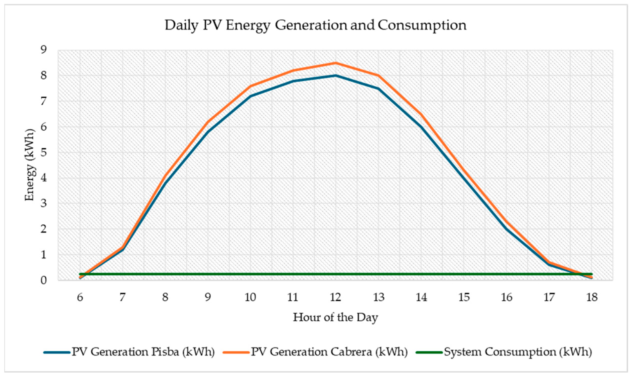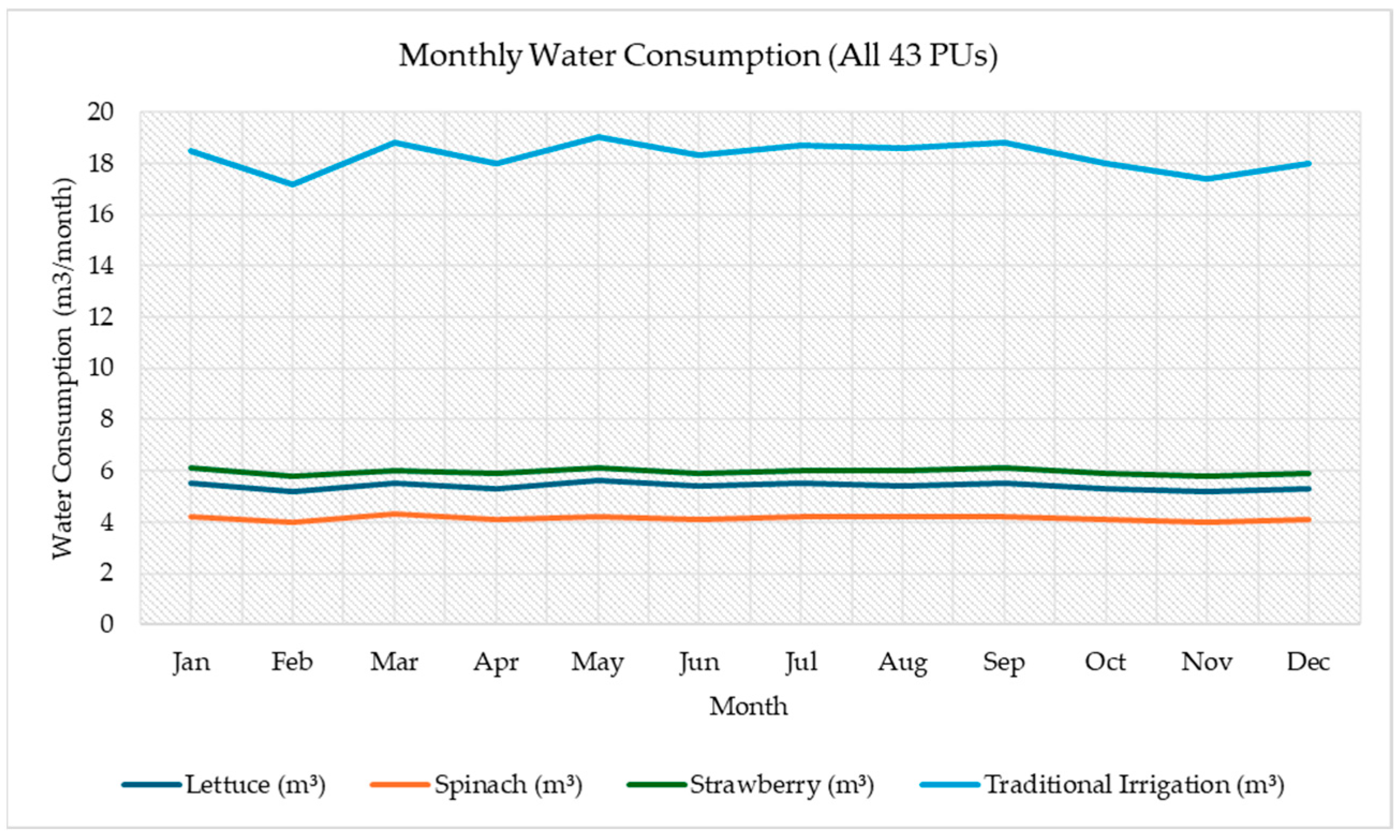 This formulation enables the quantification of the relative efficiency in water use between both production systems, establishing a dimensionless comparison that can later be correlated with energy consumption and photovoltaic generation in the integrated WEFSCC framework. By maintaining consistency with the FAO [47] guidelines and national technical manuals [65,66,67], this methodological approach ensures the reproducibility of calculations and provides a standardized basis for developing daily and annual water-consumption curves to be presented in subsequent sections. This formulation enables the quantification of the relative efficiency in water use between both production systems, establishing a dimensionless comparison that can later be correlated with energy consumption and photovoltaic generation in the integrated WEFSCC framework. By maintaining consistency with the Ref. [47] guidelines and national technical manuals [65,66,67], this methodological approach ensures the reproducibility of calculations and provides a standardized basis for developing daily and annual water-consumption curves to be presented in subsequent sections.