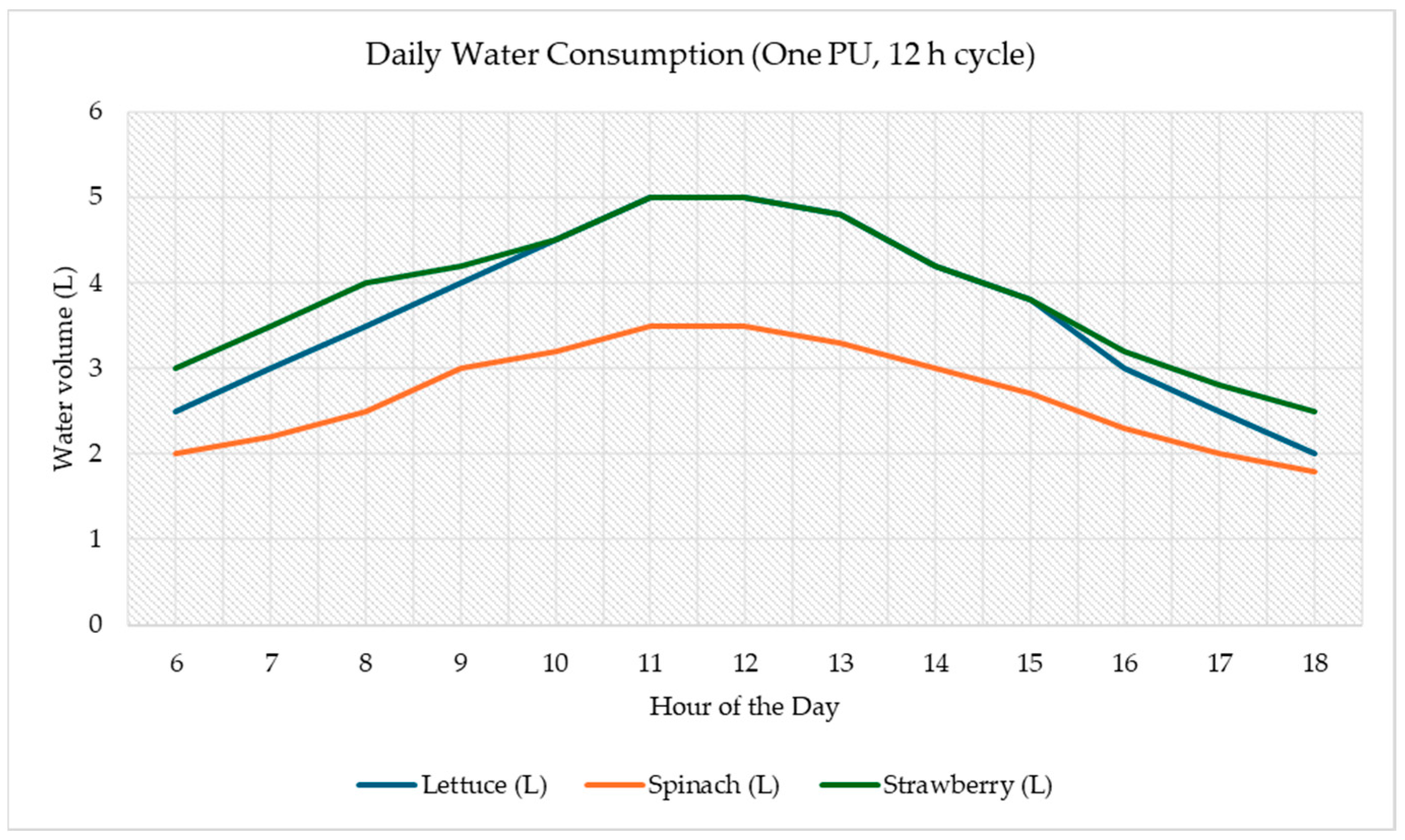 All crops were modeled under a vertical hydroponic system with recirculation, where nutrient-enriched water flows through stacked towers. Each module integrates an NFT-type circulation loop, minimizing water losses through evapotranspiration and leakage. The nutrient solution maintains a pH between 5.5 and 6.5 and electrical conductivity (EC) between 1.5 and 2.0 mS cm−1, ensuring macro- and micronutrient balance [67]. The towers operate with a solution turnover of 3–4 L per plant per cycle [65].
