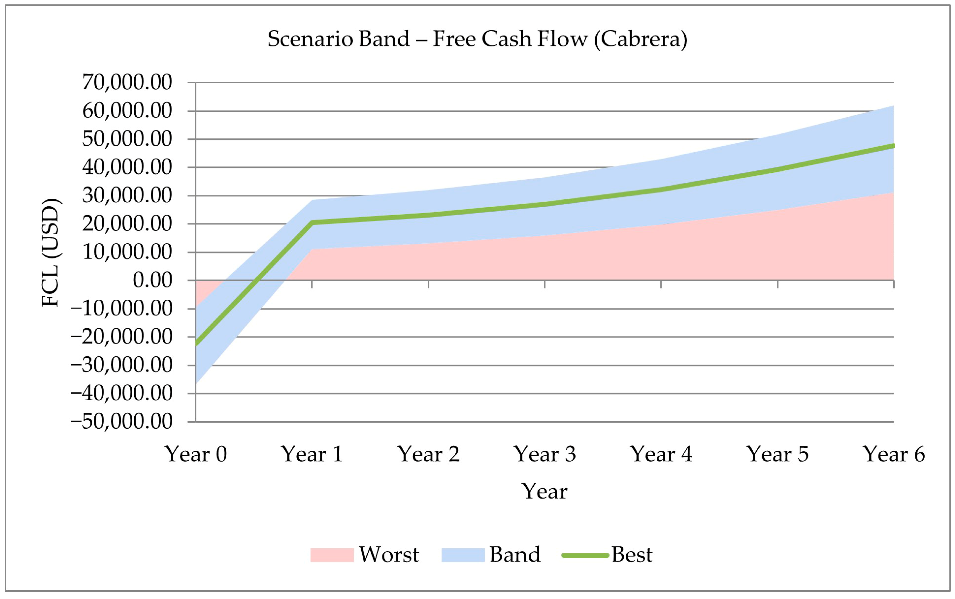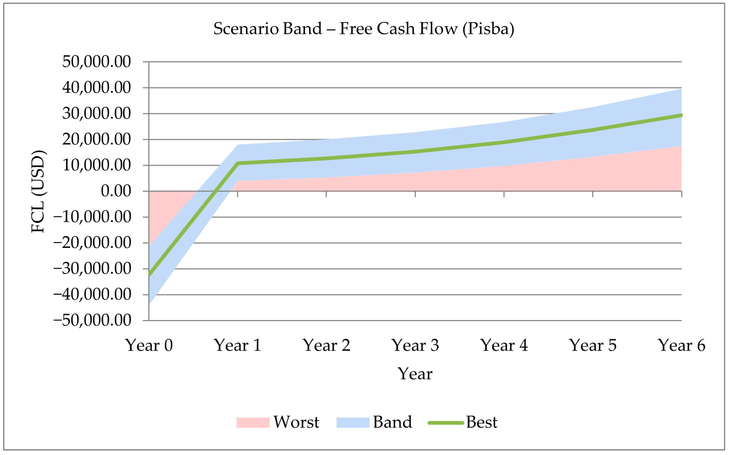 After subsystem integration, the combined outputs were analyzed under the WEFSCC nexus, incorporating quantitative and qualitative variables. Quantitative indicators included water-use efficiency, energy generation, and economic performance metrics such as Net Present Value (NPV), Internal Rate of Return (IRR), and Free Cash Flow (FCL); when pertinent to investment comparisons, CapEx and OpEx were also considered. Qualitative dimensions such as soil optimization, climate variability, and community participation were examined through semi-structured stakeholder interviews, document analysis, and expert consultation to capture governance factors and contextual constraints that condition adoption and scalability.