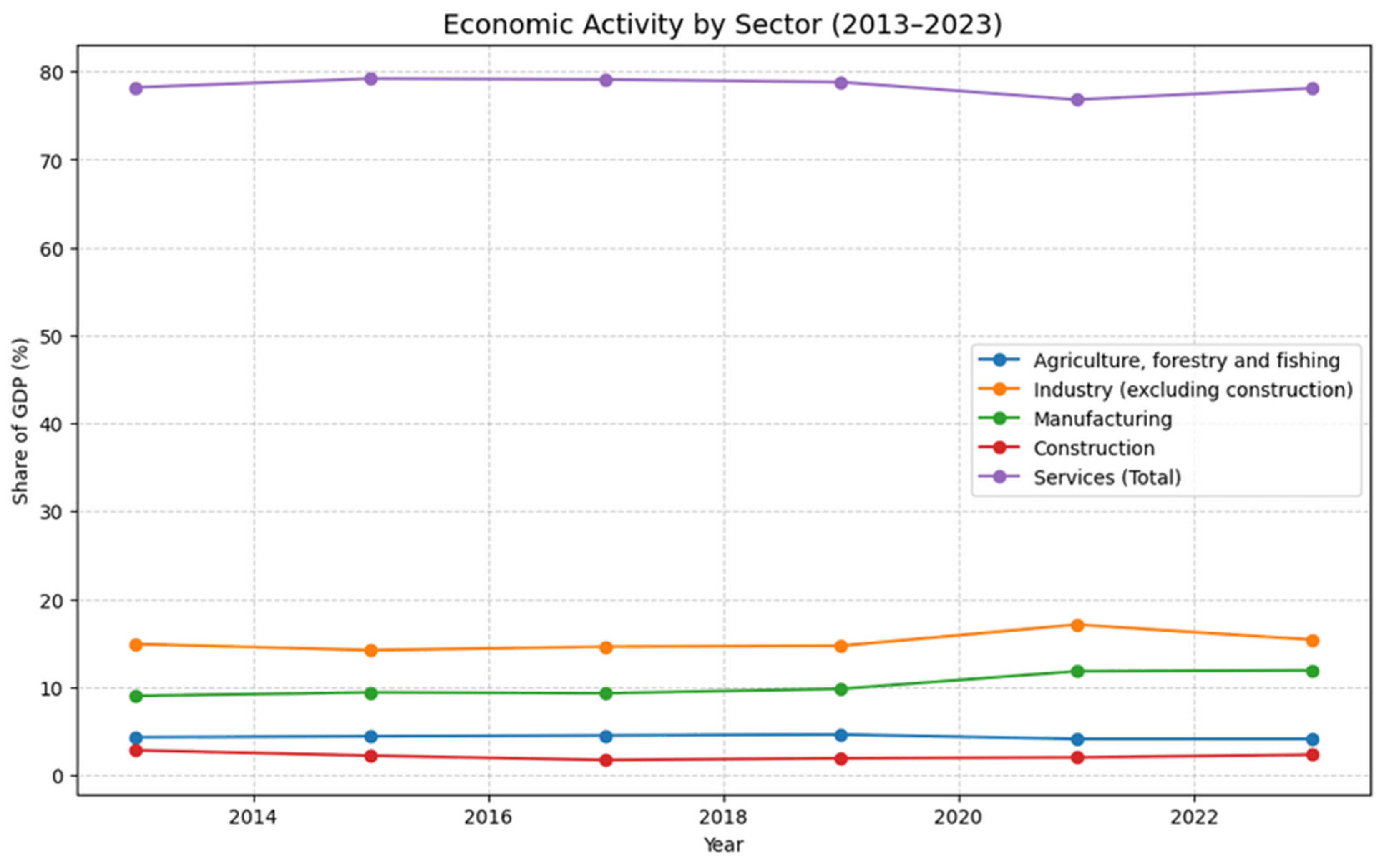 This chart illustrates the evolution of the main sectors of economic activity as a share of GDP between 2013 and 2023. The services sector consistently dominates the economy, maintaining a share close to 78–79% throughout the period, highlighting its structural importance. Industry (excluding construction) shows moderate stability with a slight increase until 2021, before a small decline by 2023 [