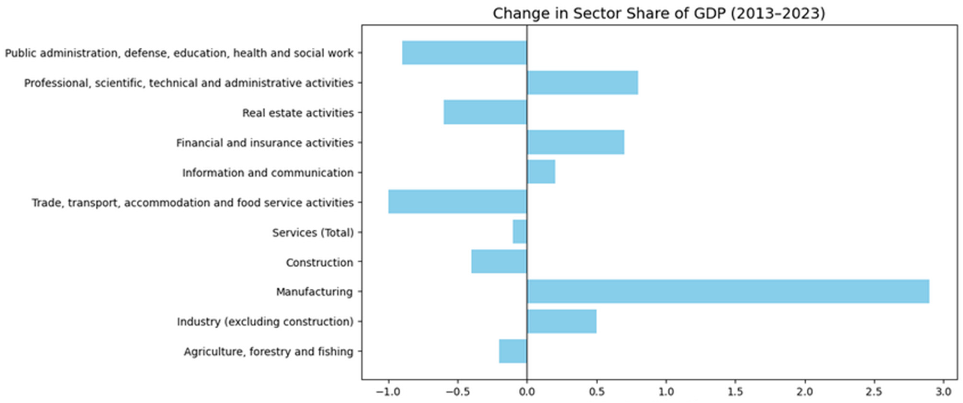 This bar chart highlights the net changes in sectoral contributions to GDP between 2013 and 2023. Manufacturing recorded the largest positive shift, gaining almost 3 percentage points, reflecting industrial strengthening within the economy. Professional, scientific, and technical activities, as well as financial services, also posted moderate gains, showing a trend toward knowledge- and finance-driven growth. By contrast, trade and transport services, public administration and health, and real estate activities declined slightly, indicating structural adjustments in traditional service-based sectors. Agriculture and construction remained relatively stable, with small negative shifts. Overall, the chart underscores a gradual diversification of the economy, with manufacturing and specialized services playing an increasingly important role.