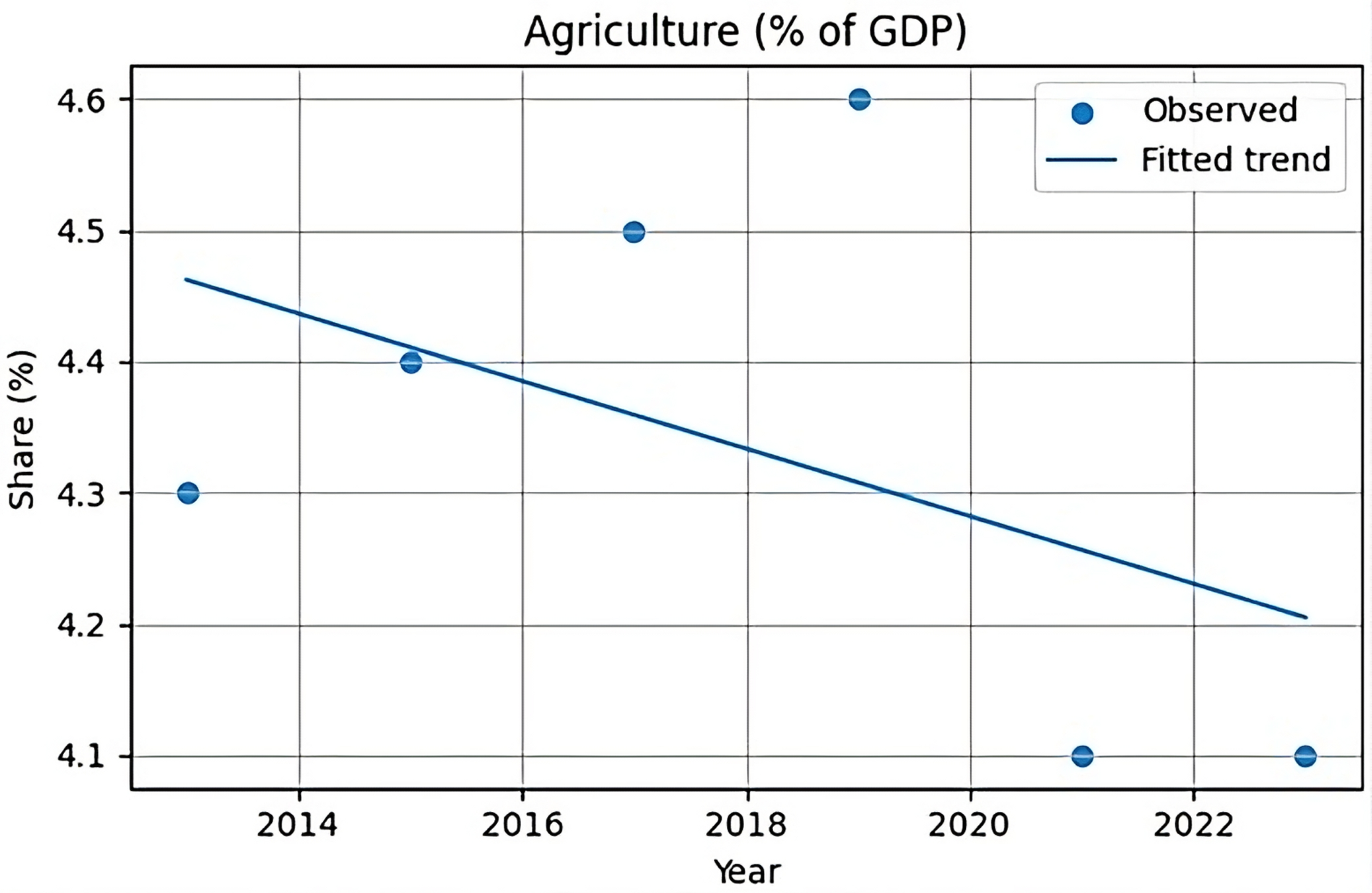 This chart illustrates the evolution of agriculture’s share of GDP between 2013 and 2023. The observed data points fluctuate slightly, with peaks around 2017–2019, but the fitted regression trend reveals a gradual decline over the decade. The downward slope indicates that agriculture’s relative contribution to GDP is shrinking, consistent with structural shifts in the economy toward services and manufacturing. Despite temporary increases in certain years, the overall negative trajectory highlights the long-term weakening of the agricultural sector’s weight in national output.