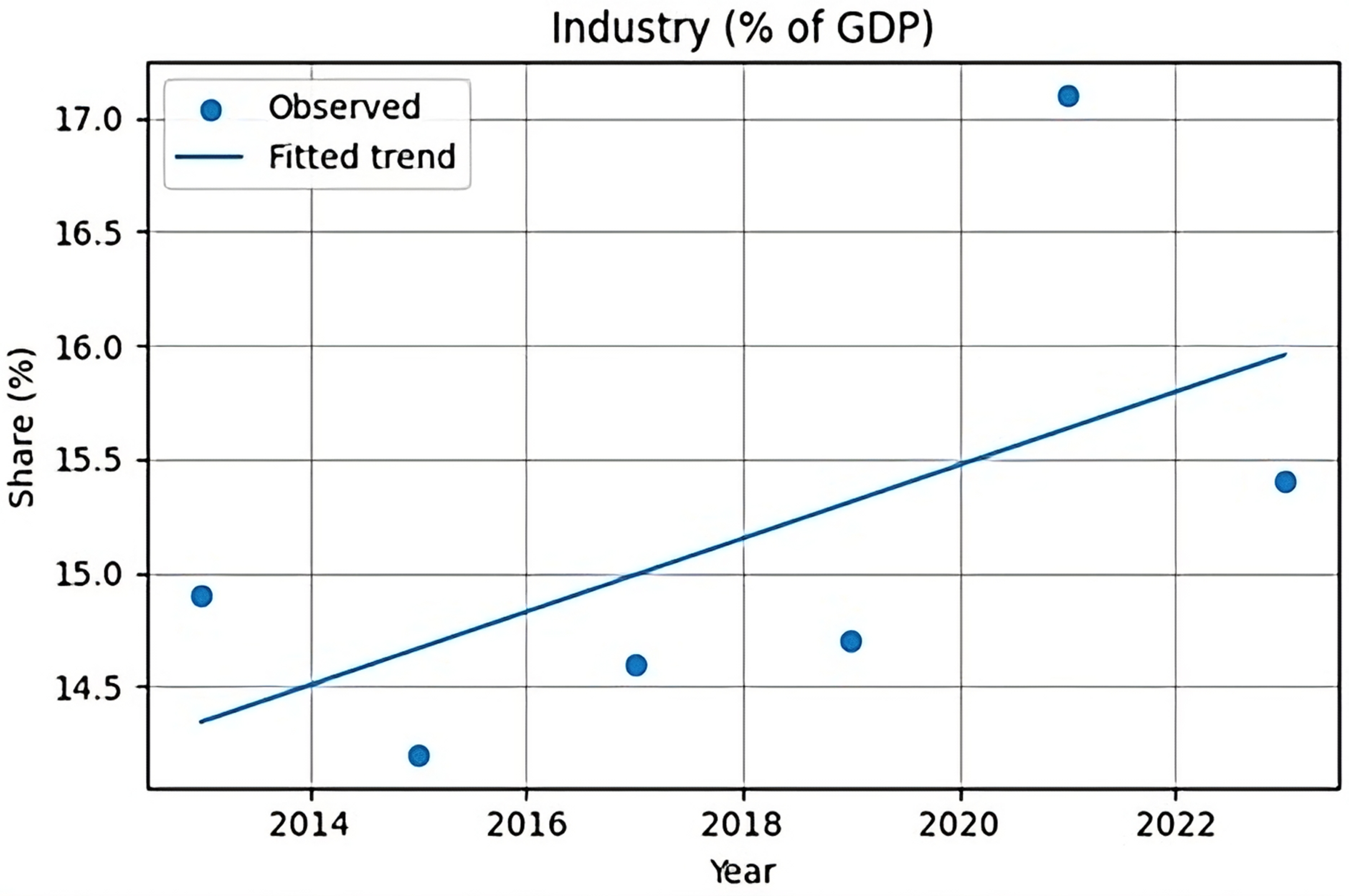 This chart shows the evolution of the industry’s share of GDP from 2013 to 2023. The observed data points fluctuate modestly, with a dip around 2015 and peaks in 2021, when the sector briefly exceeded 17%. Despite these ups and downs, the fitted regression line indicates a clear positive trend, suggesting that the industry’s overall contribution to GDP has been gradually increasing over the decade. This upward trajectory reflects a relative strengthening of industrial activity within the economy, potentially driven by growth in manufacturing and related sectors.