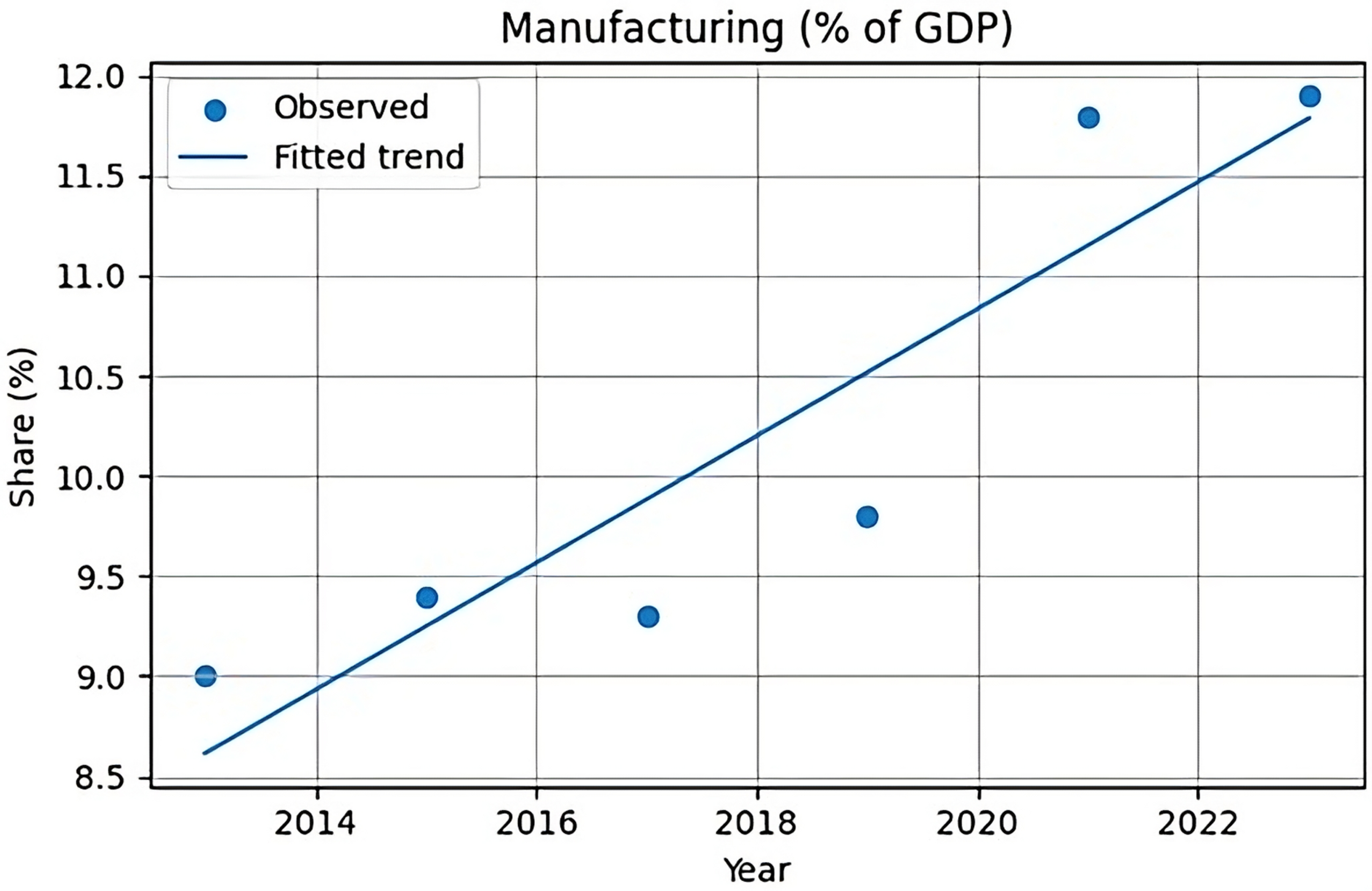This chart presents the trajectory of manufacturing’s share of GDP between 2013 and 2023. The observed data reveal an initial stability around 9%, followed by a noticeable increase after 2019, with the sector surpassing 11% by 2021 and approaching 12% in 2023. The fitted regression line shows an upward trend, indicating that manufacturing has been steadily gaining weight in the economy over the last decade. This expansion may reflect industrial recovery, rising exports, or policy support aimed at strengthening domestic production, positioning manufacturing as one of the most dynamic contributors to overall industrial growth.