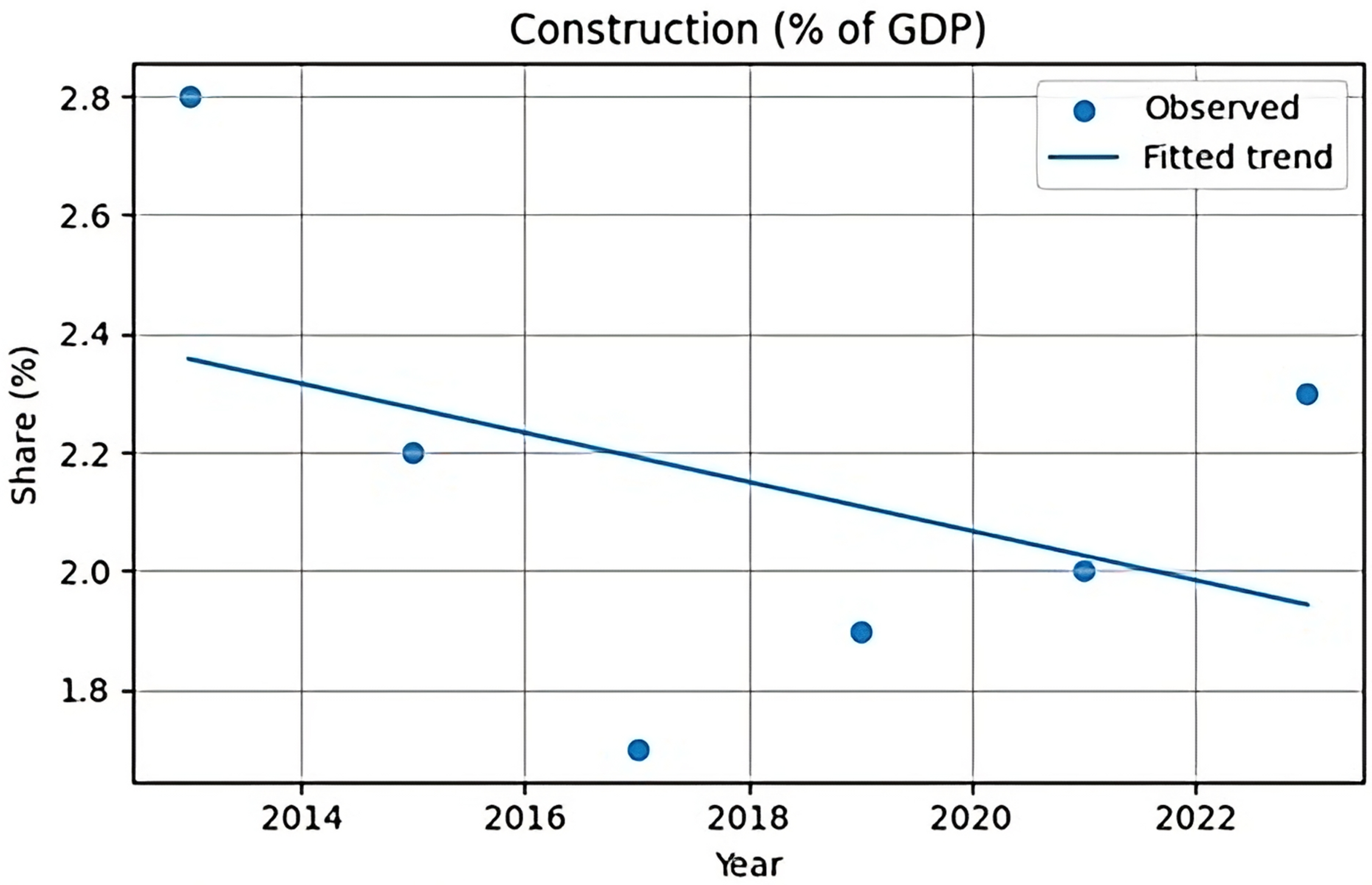 The diagram shows the evolution of construction’s share of GDP from 2013 to 2023. The observed data reveal a steep decline after 2013, when construction contributed close to 2.8%, reaching a low point below 1.8% in 2017. Although there has been some recovery in recent years, the fitted regression line shows an overall negative trend, reflecting the sector’s diminished role in the economy over the decade. This pattern is consistent with the lasting effects of the financial crisis, subdued investment in infrastructure and housing, and the slower rebound of construction relative to other sectors. The empirical estimation for the period 2013–2023 is based on the log–ratio trend model, expressed formally, the marginal effect of time on the sectoral share ratio is as follows: