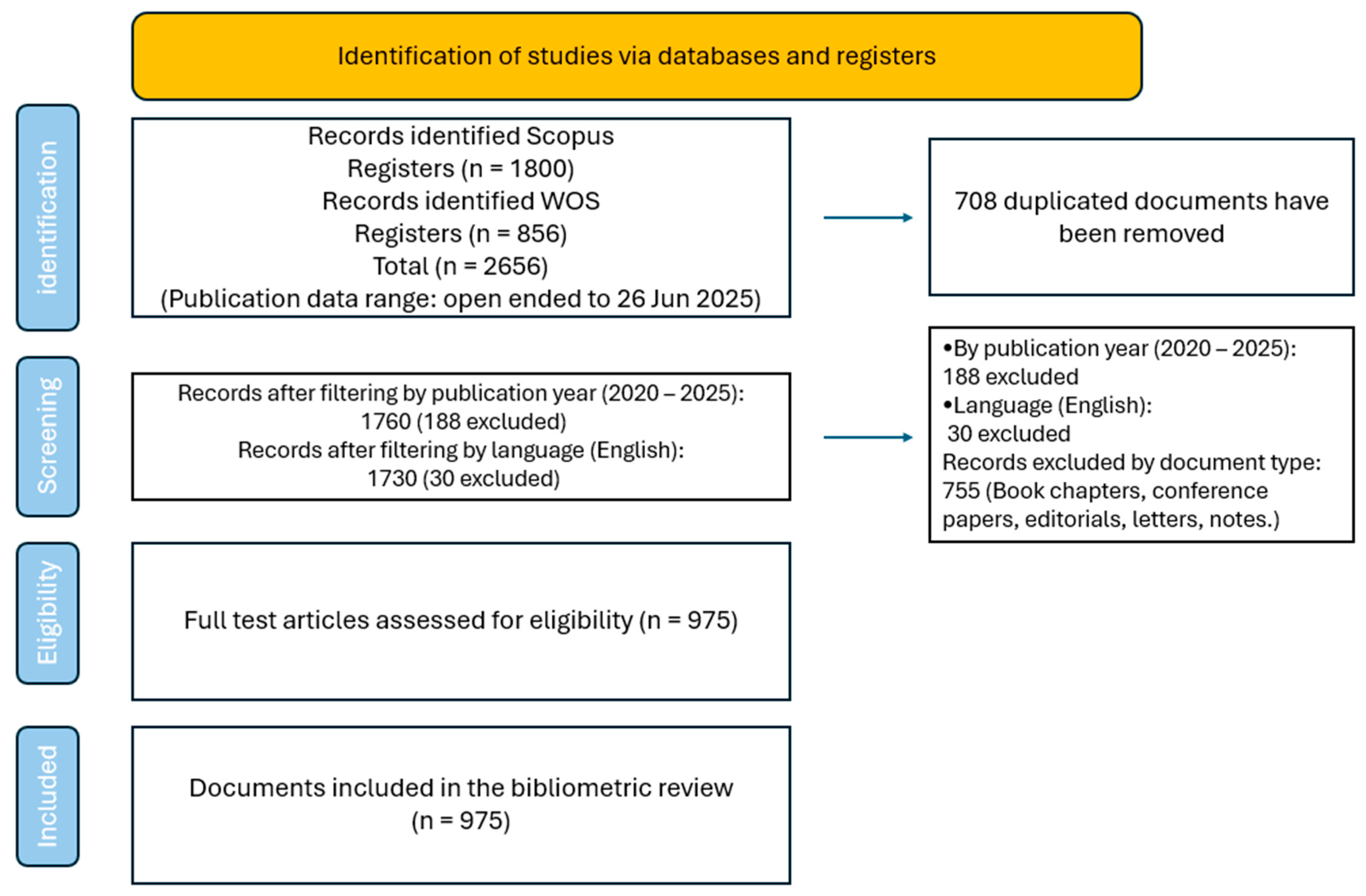 The study began with the collection of 1800 records from Scopus and 856 from Web of Science (WoS), which represented an initial total of 2656 entries. After the elimination of 708 duplicates, the sample was reduced to 1948 unique documents. Different filtering criteria were then applied. First, 188 records that were not within the established time range (2020–2025) were excluded. Filtering was subsequently carried out by language, keeping only documents in English and eliminating 30 additional entries. Finally, documents that did not correspond to peer-reviewed scientific articles or reviews were discarded, including 755 non-peer-reviewed works such as book chapters, conference papers, and editorials. This decision was made because articles and reviews are considered to provide the highest scientific quality and comparability, ensuring greater rigor and reliability in bibliometric analyses. This filtering process allowed delimitation of the final sample to 975 peer-reviewed scientific articles and reviews included in the bibliometric analysis. This exclusion criterion follows standard bibliometric methodology, which prioritizes peer-reviewed journal articles and reviews as the most comparable and standardized units of analysis. Book chapters, conference proceedings, and editorials were excluded because they are often not subject to the same peer-review rigor, may follow heterogeneous citation patterns, and are inconsistently indexed across databases. Focusing on journal publications ensures higher methodological consistency, allowing reliable comparison of citation metrics, authorship, and thematic structures across the dataset.