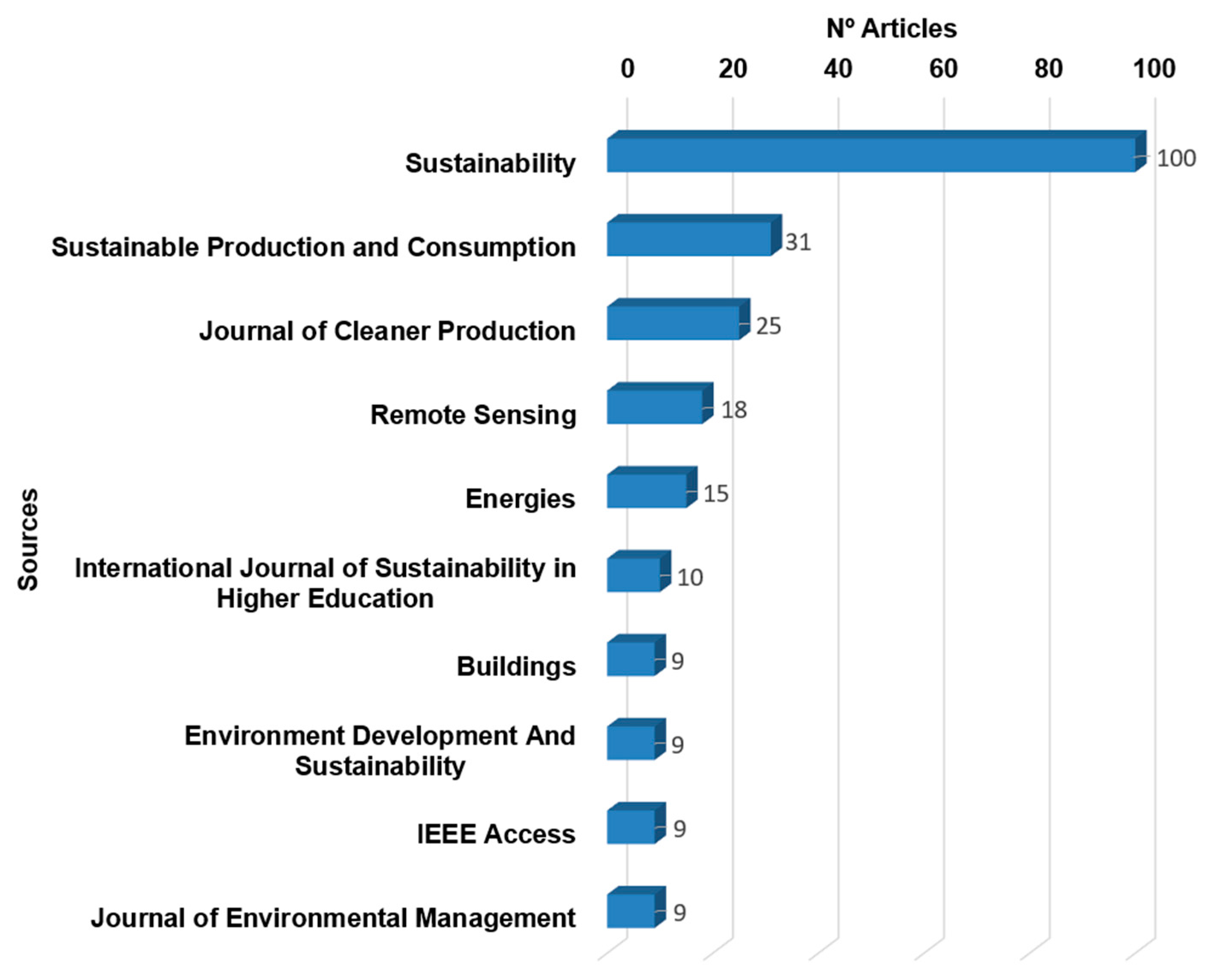 The analysis of the most relevant sources shows a clear predominance of the journal Sustainability, which concentrates on the largest number of publications related to sustainable development. As shown in
