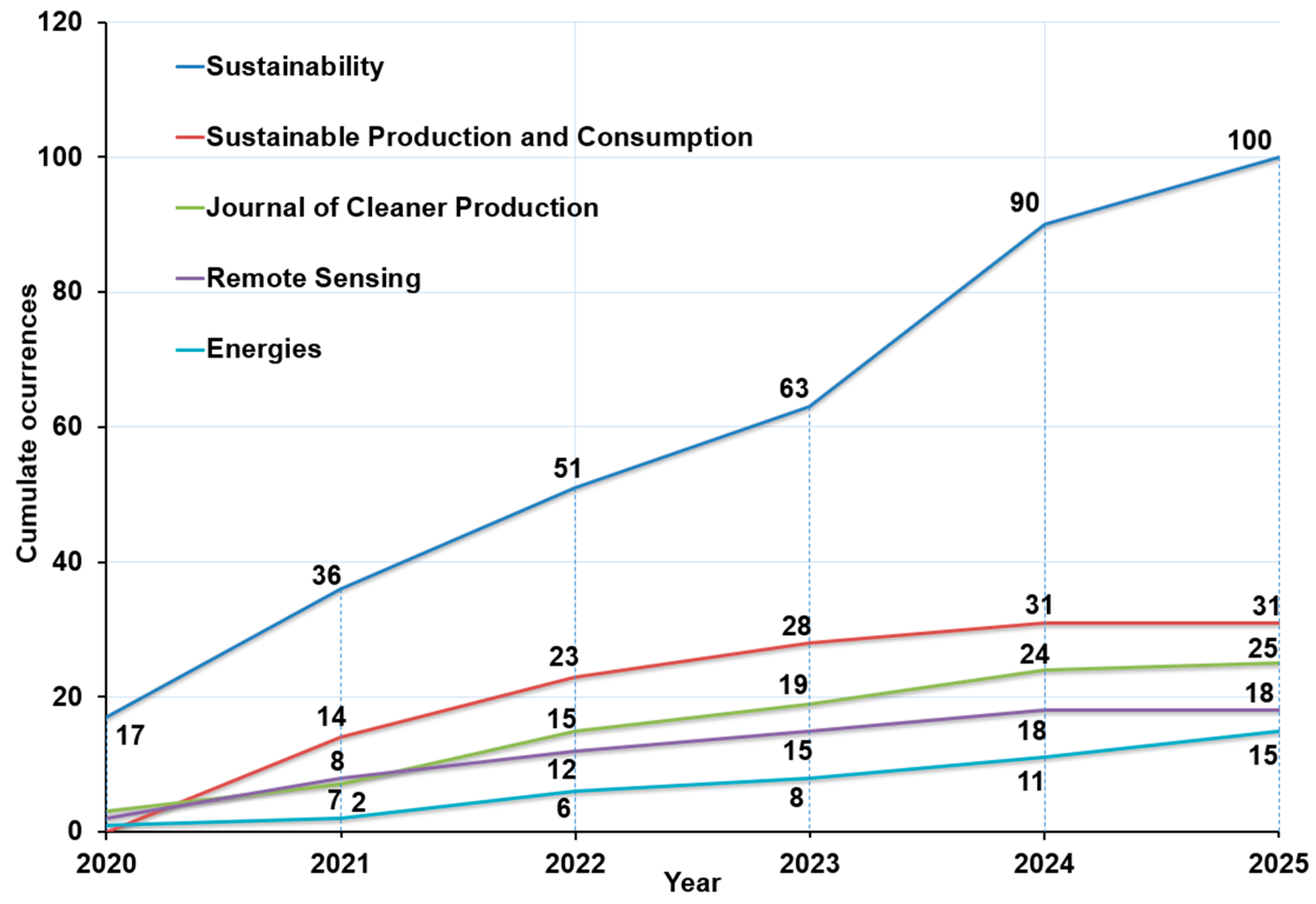 Figure 4 illustrates the temporal evolution of the accumulated scientific production in the main journals between 2020 and 2025. A sustained growth is observed in Sustainability, which has experienced a constant and marked increase throughout the analyzed period, reaching a cumulative maximum of 100 publications in 2025. The rest of the sources show a more moderate and stable evolution, highlighting Sustainable Production and Consumption and Journal of Cleaner Production, which also reflect a growing trend, although less pronounced.