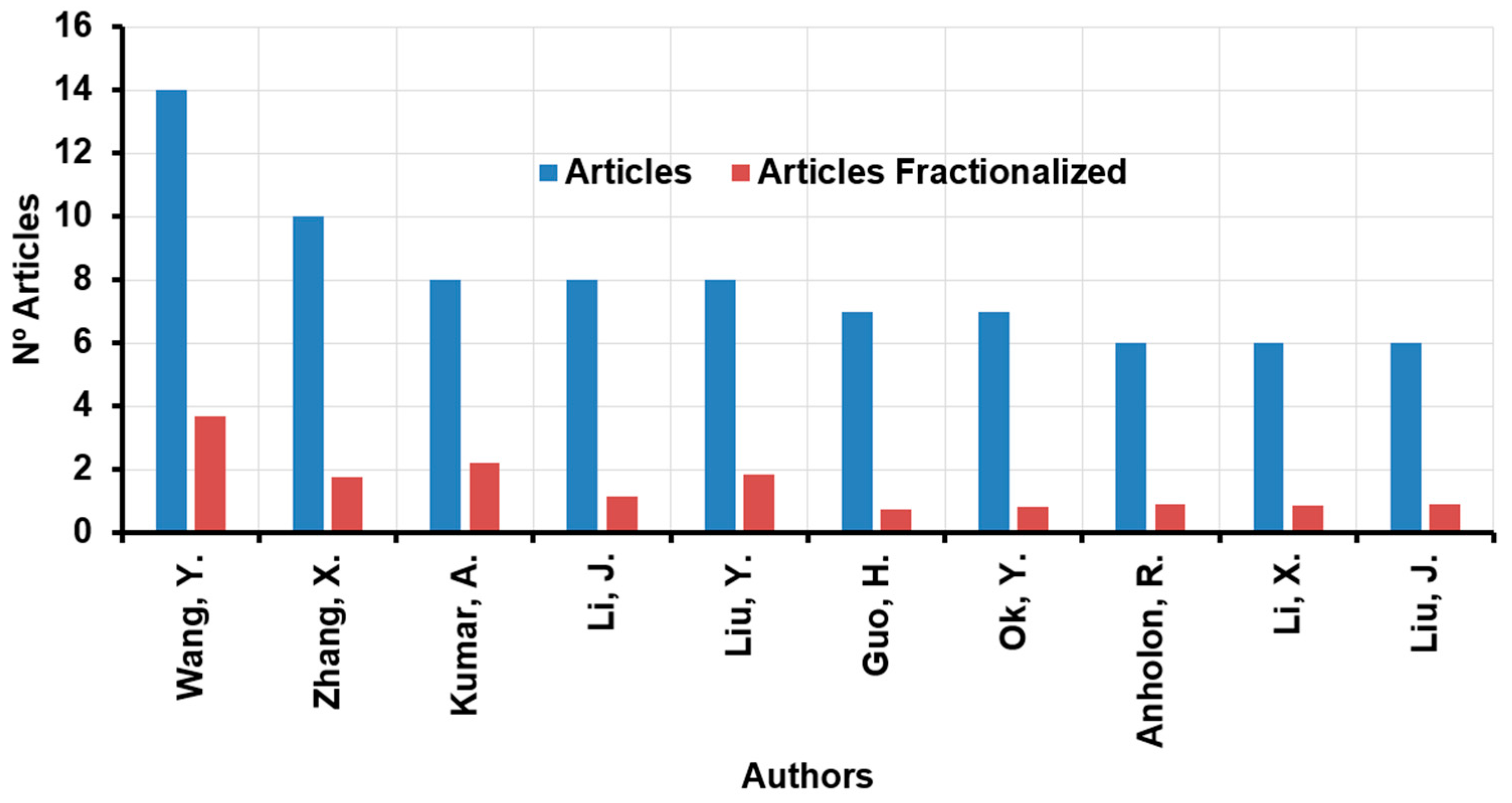Figure 5 shows the authors who have published the largest number of works in the period analyzed from 2020 to 2025. WANG Y stands out with 14 publications and ZHANG X with 10, followed by several researchers with between 6 and 8 articles. The column labeled “Articles Fractionalized” represents the weighted contribution of each author, considering co-authorship. This means that the total number of articles is proportionally divided among all authors of each paper to better reflect individual productivity.