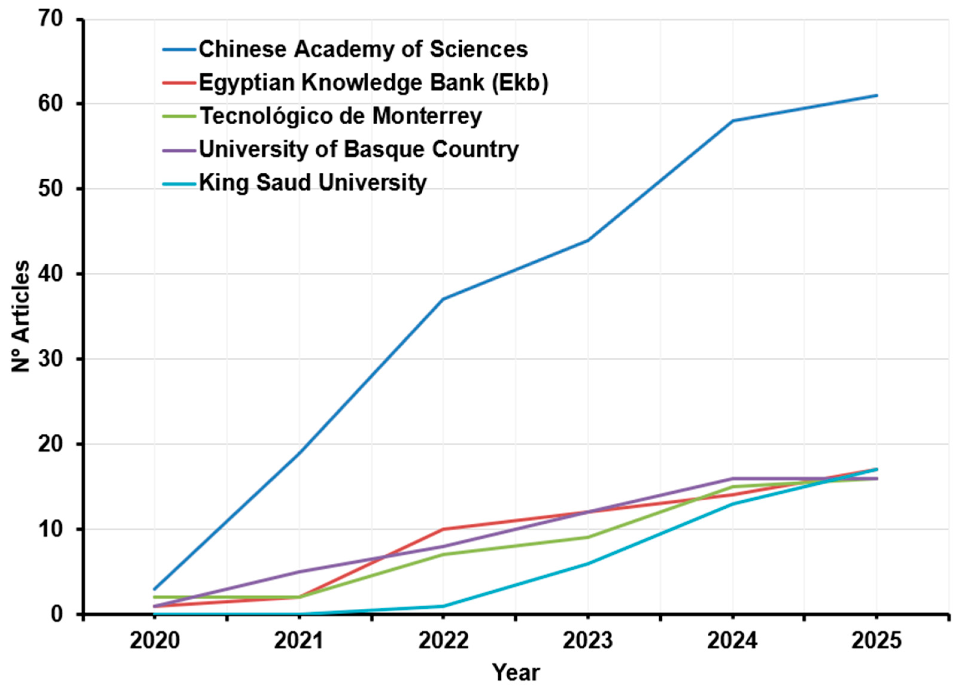 Figure 6) shows that the Chinese Academy of Sciences stands out in the lead, reaching more than 60 accumulated publications. Other relevant institutions are the Egyptian Knowledge Bank, Tecnológico de Monterrey, and the University of the Basque Country, which have more moderate production and more gradual growth.