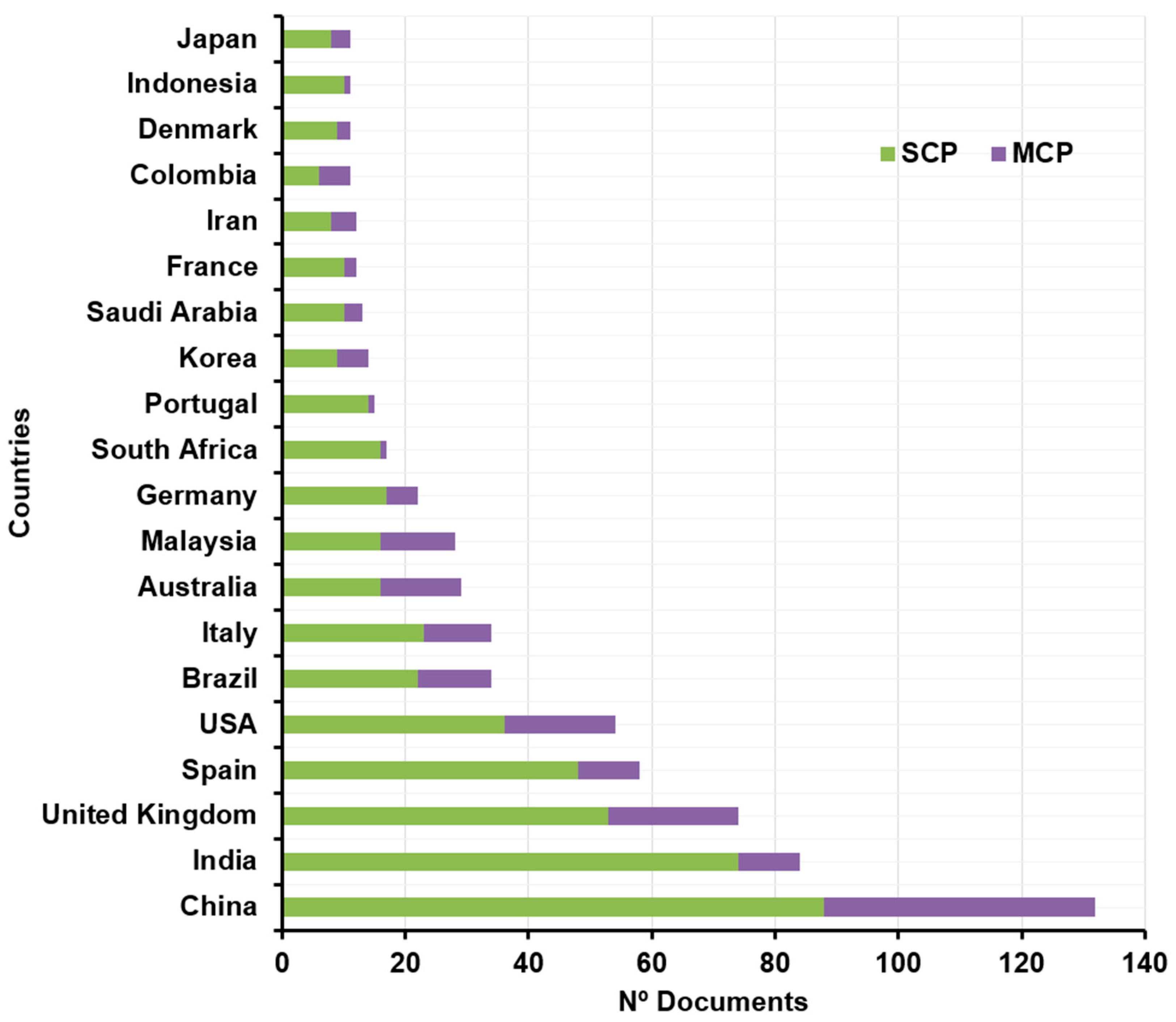 Figure 7, shows the country of the main affiliation of the corresponding authors, distinguishing between single country publications (SCP) and multiple country publications (MCP). China and India are the countries with the highest number of publications, followed by the United Kingdom and the United States.