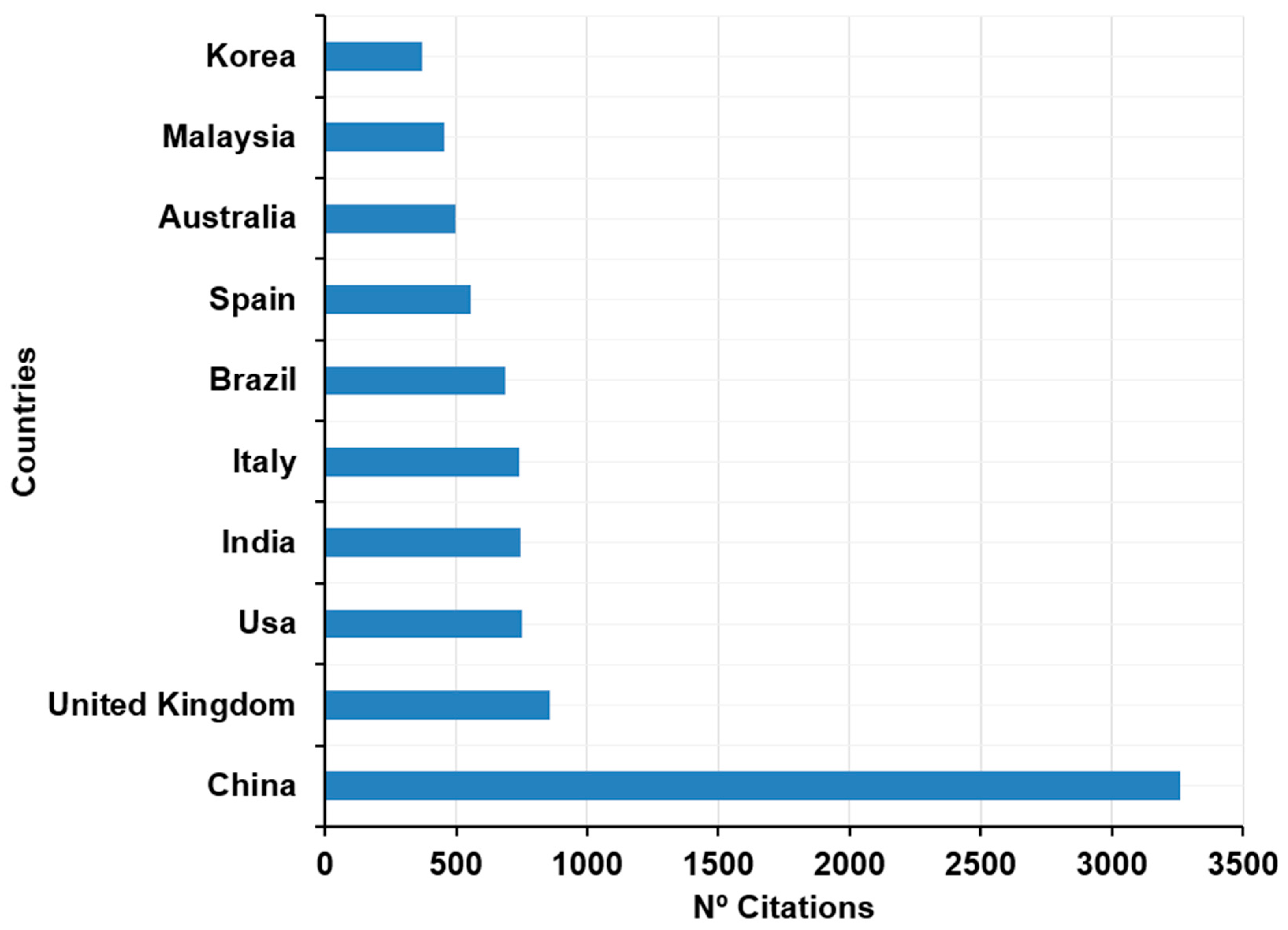 Figure 9 shows the total number of citations accumulated by country. China stands out with 3263 citations, reflecting a clear leadership in terms of global impact. It is followed by the United Kingdom and the United States with 859 and 752 citations, respectively. This distribution highlights the importance of China compared to other countries regarding the subject under study.