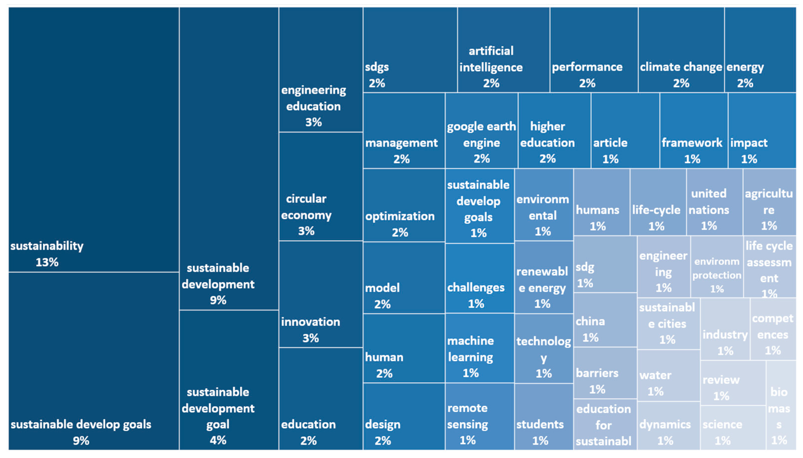 Figure 13). These fields are both widely addressed and structuring for the subject, articulating global discussions, scientific agendas, and practical applications. In parallel, aspects such as sustainability, sustainable development goals, and engineering education appear as basic topics, which reflect their great cross-cutting relevance, although still in the process of consolidation and theoretical and methodological deepening within literature.