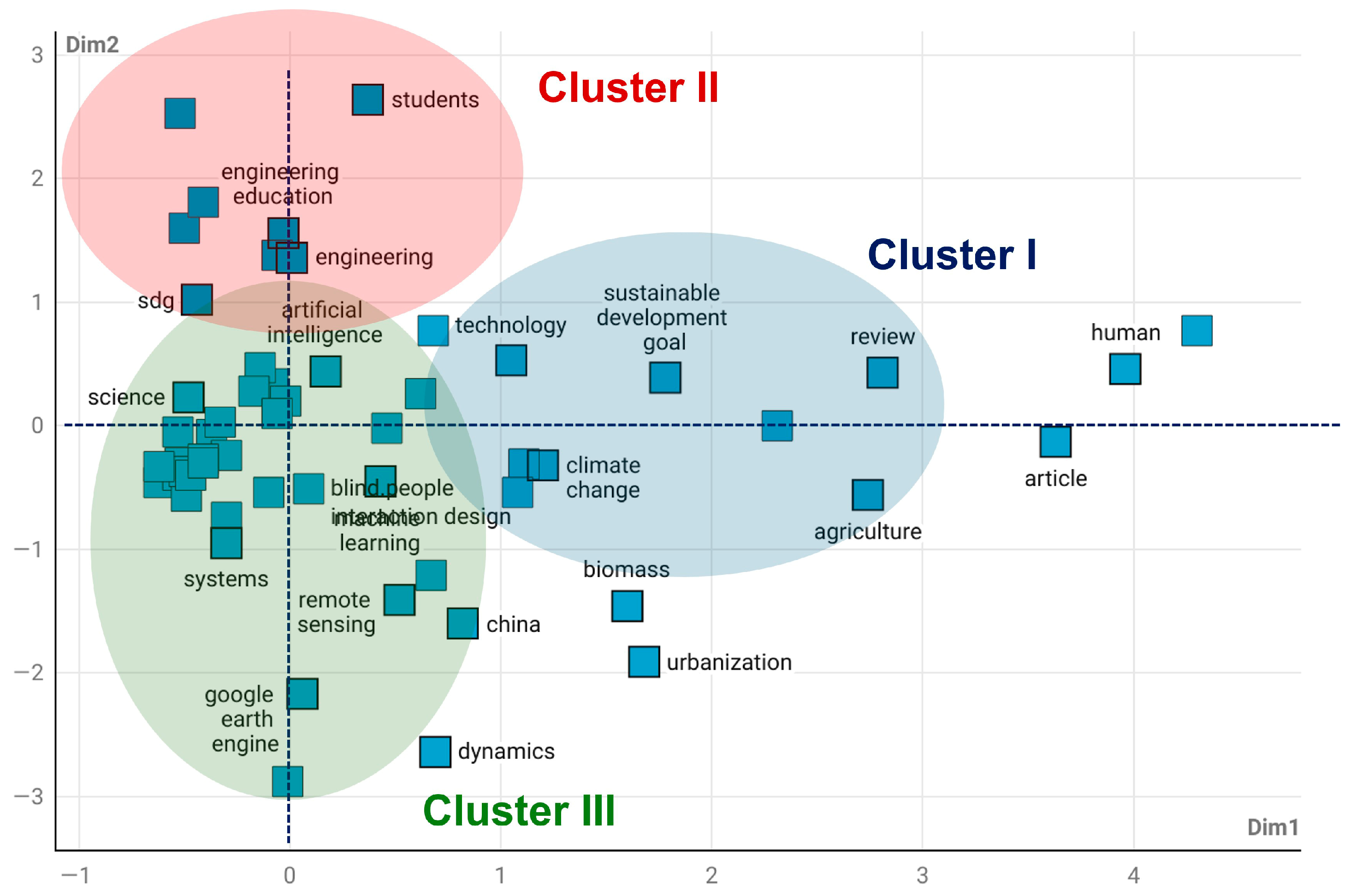 Figure 11). The factorial map is based on Multiple Correspondence Analysis (MCA) of authors’ keywords. Dim1 and Dim2 represent the first and second dimensions extracted from this analysis, explaining the major conceptual relationships among keywords. Dim1 groups topics related to global sustainability frameworks (e.g., SDGs, inclusion), while Dim2 clusters terms associated with education and technological applications in engineering.