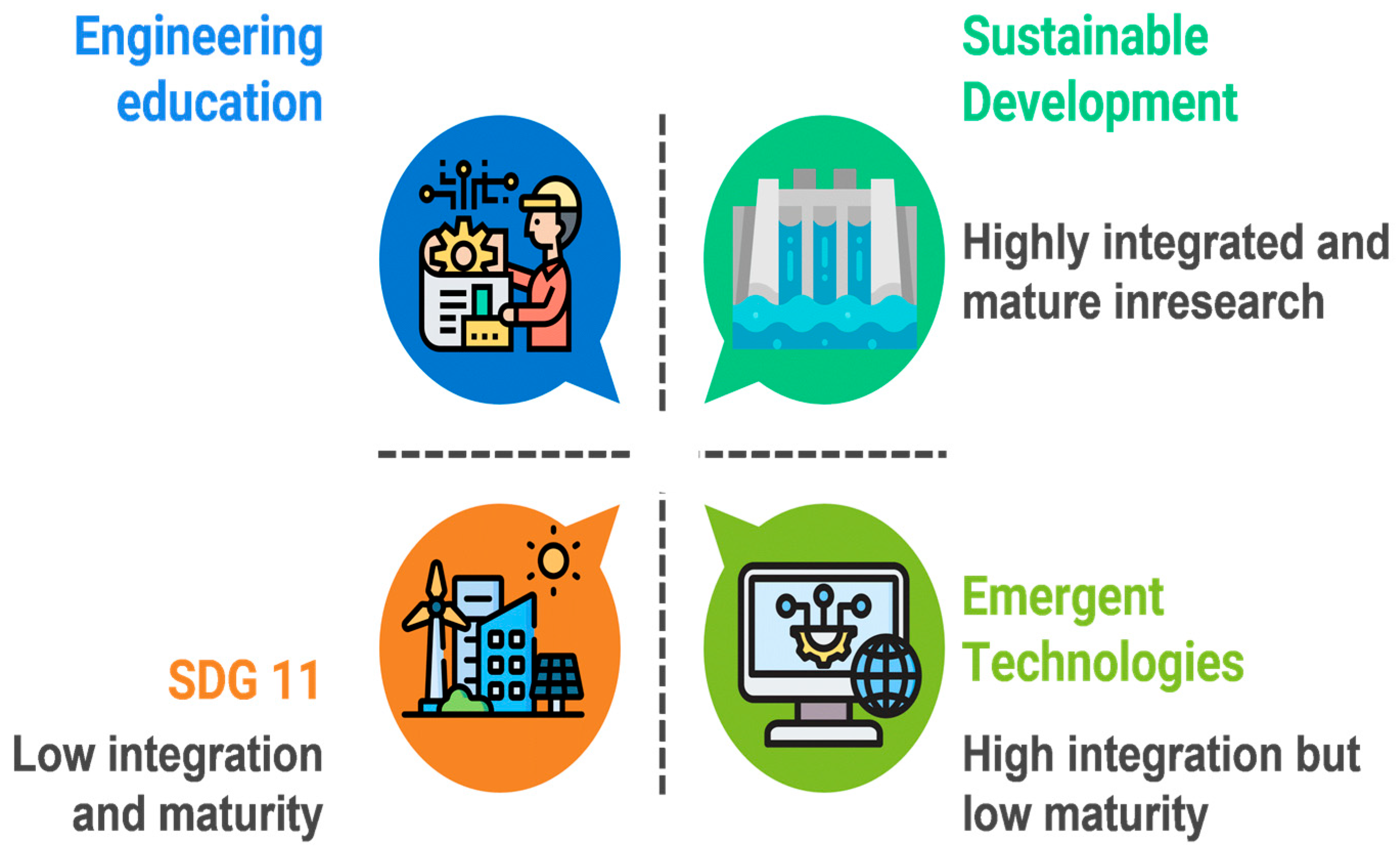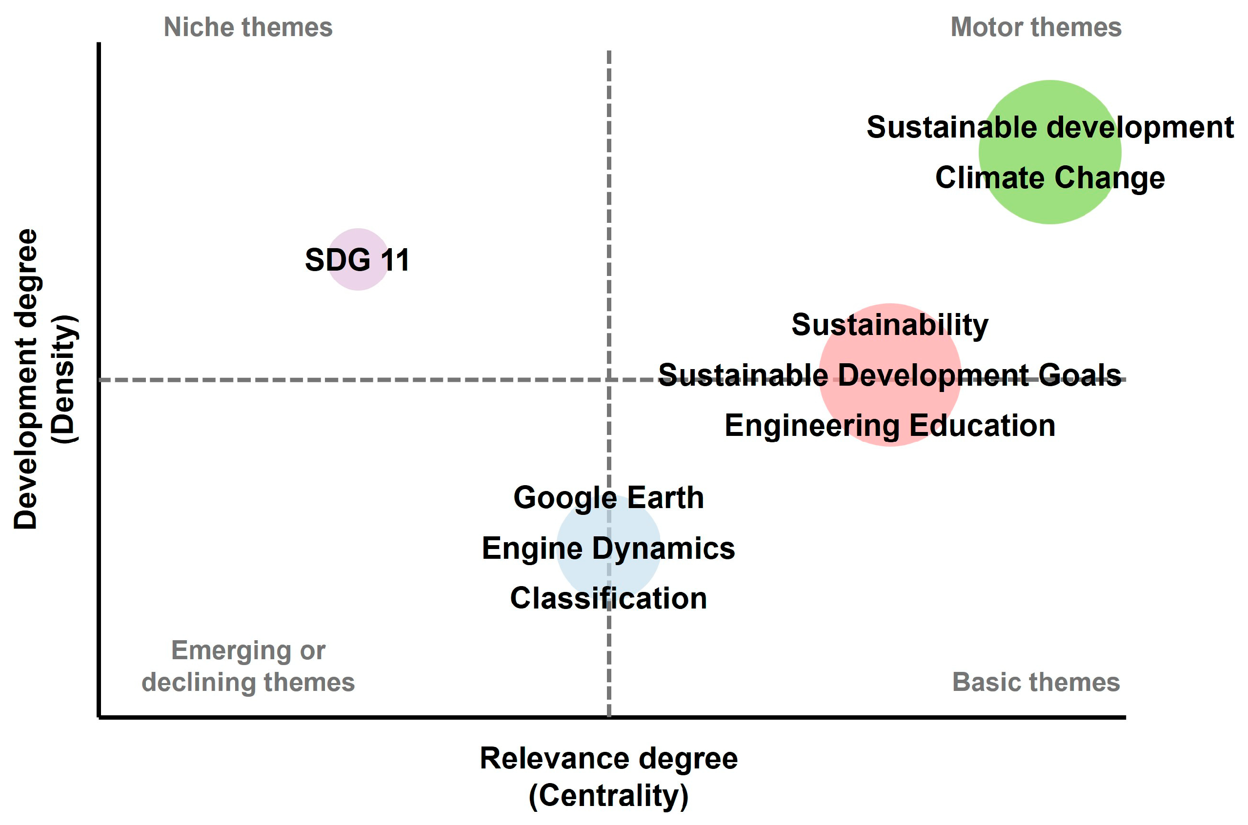 39]. In the quadrant of basic themes, “Sustainability”, “Sustainable Development Goals”, and “Engineering Education” stand out, which, although fundamental and highly connected with the rest of the topics, may still be in a process of deepening or theoretical expansion.