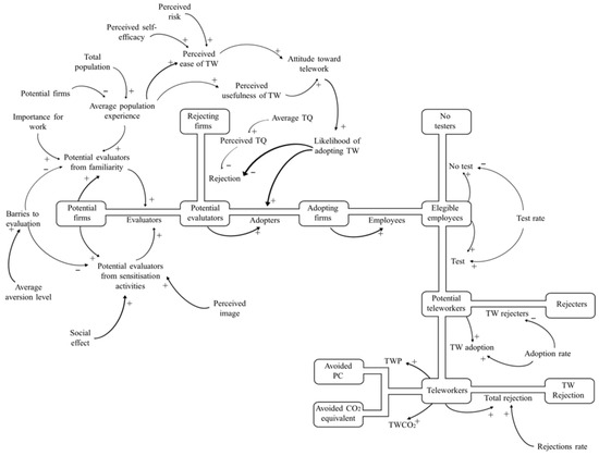 In Figure 2, Positive causal influence means a direct relationship between two variables: when Variable A increases, so does Variable B, and vice versa (where all else is constant). On the other hand, negative causal influence indicates an inverse relationship between two variables; that is, an increase in Variable A would lead to a decrease in Variable B, or a de-crease in Variable A would lead to an increase in Variable B (all else constant) [45]. The diagram traces a sequential representation from potential adopter firms to potential evaluating organizations, illustrating the pathway that leads either to the adoption or rejection of telework practices. Additionally, it details the progression from adopter organizations to individual teleworkers and, ultimately, outlines the environmental impacts attributed to teleworkers.