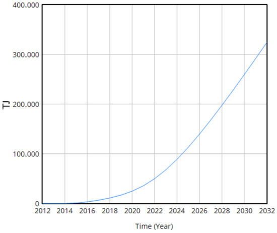 Environmental contributions of telework are highly valued in companies in accordance with sustainable development goals. The adoption of telework has a notable impact on energy consumption in the country (Figure 5). It shows the baseline projection of avoided energy consumption associated with telework adoption in Colombia between 2012 and 2032. The curve starts with negligible savings during the early years but begins to rise noticeably after 2018, reflecting the acceleration in telework adoption. From 2020 onwards, avoided energy consumption grows exponentially, surpassing 168,000 TJ by 2027. This trend highlights the cumulative effect of widespread telework adoption, where incremental savings per worker aggregate into substantial national-level energy reductions over time.