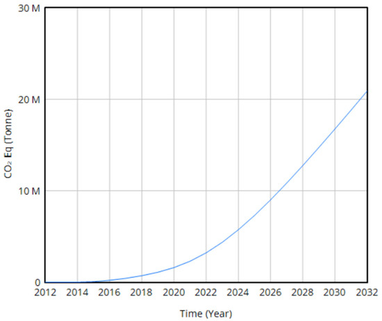 An individual who teleworks would have an impact on the reduction in the carbon footprint of approximately 1.29 t of CO2 equivalent per year [83]. Figure 6 illustrates the baseline projection of CO2 equivalent emissions avoided in Colombia as a result of telework adoption from 2012 to 2032. The curve shows minimal reductions in the early years, reflecting the limited penetration of telework before 2018, as adoption accelerates after 2020, avoided emissions increase steadily, reaching a marked inflection around 2025. From this point onward, the trajectory becomes steeper, highlighting the cumulative impact of reduced commuting-related transport emissions, where by 2032, the model estimates that avoided emissions could exceed 20.9 t of CO2 equivalent, under-scoring the potential contribution of telework policies to national mitigation strategies in the transport sector, corresponding to 2% per year, according to projections of CO2 equivalent emissions [88].