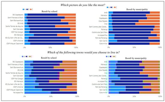 - b2. Symbolic representation: These questions draw on established methodologies in tourism research, particularly the use of image-based preference tests to explore affective and motivational responses to landscapes []. These techniques aim to reveal the symbolic meanings and emotional associations that individuals attach to different environments, offering insights into how people perceive, idealize, or identify with landscape types. Students were shown a series of standardized images and asked two questions. First, they were asked to choose the image they liked the most. Second, they were asked to indicate in which landscape they would prefer to live. All images were generated using artificial intelligence to deliberately avoid depicting specific, recognizable locations in Mallorca. This approach was chosen to ensure neutrality, preventing students from being influenced by personal familiarity or associations with particular towns.