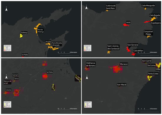 Historically, the configuration of Mallorcan settlements reflects longstanding defensive strategies. Many towns were deliberately established several kilometers inland to protect inhabitants from coastal attacks, particularly during periods of frequent piracy and military threats [,]. This historical pattern resulted in a clear distinction between inland urban centers and their corresponding ports, as seen in examples such as Pollença and Port de Pollença or Sóller and Port de Sóller. This spatial organization was further transformed by the 20th-century tourism boom, which dramatically reshaped Mallorca’s territorial dynamics []. The landscape became increasingly bifurcated into tourism-oriented coastal zones and urbanized or agricultural interiors. Tourism-driven urban expansion led to the emergence of new social spaces that disrupted traditional socio-economic patterns, benefiting local communities in some ways, but also generating new territorial and social disconnections []. These transformations continue to influence symbolic geographies today, reinforced through education, media representations, and local development practices []. This divide is clearly illustrated in Figure 1, which shows that in many coastal municipalities, the historical and administrative centers are located approximately 10 km inland, while the primary economic activities now take place in the coastal resort areas.