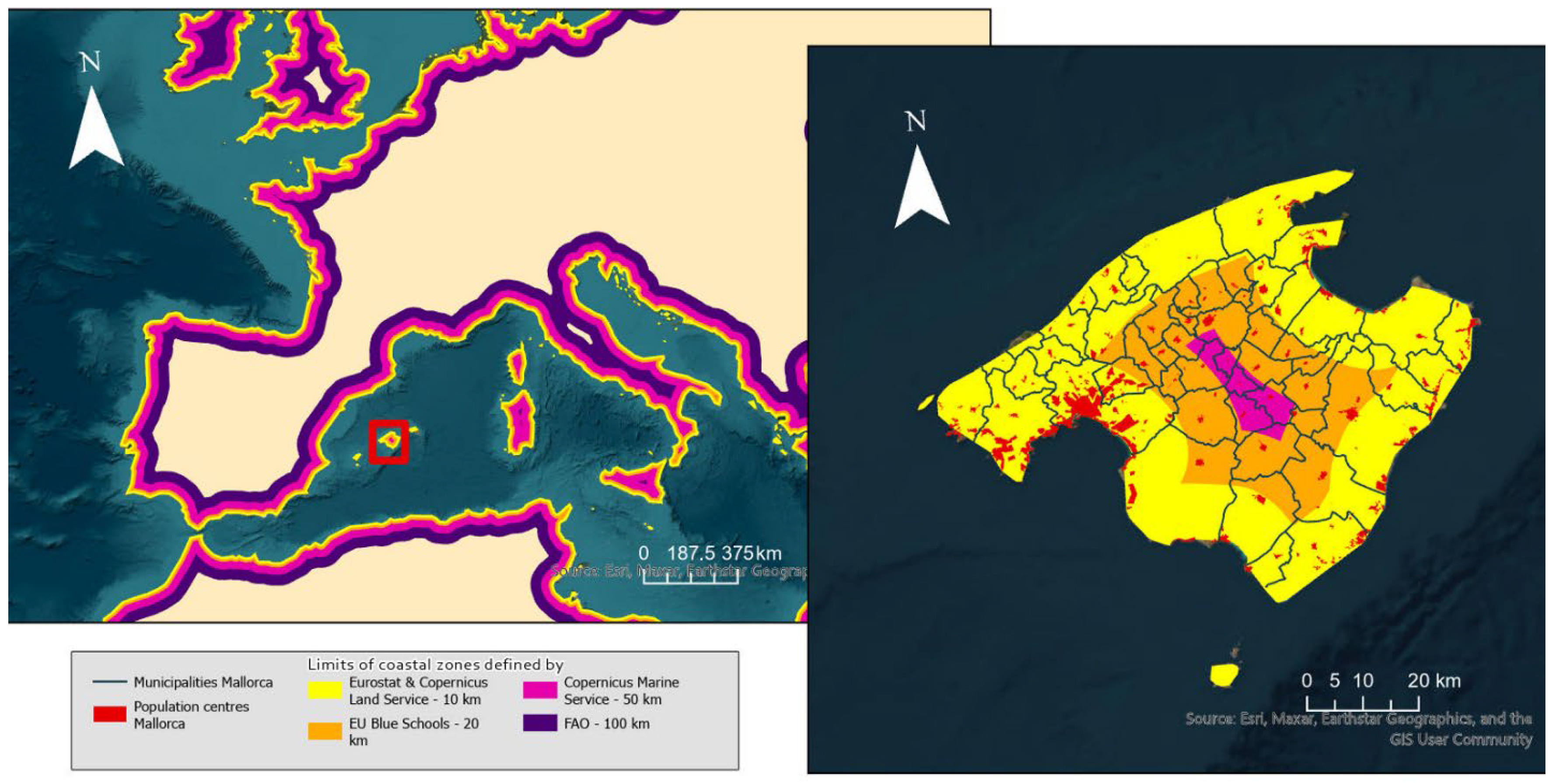 - Esteva-Burgos, C.; Ruiz-Pérez, M. Modeling Spatial Determinants of Blue School Certification: A Maxent Approach in Mallorca. ISPRS Int. J. Geoinf. 2025, 14, 378. [Google Scholar] [CrossRef]
