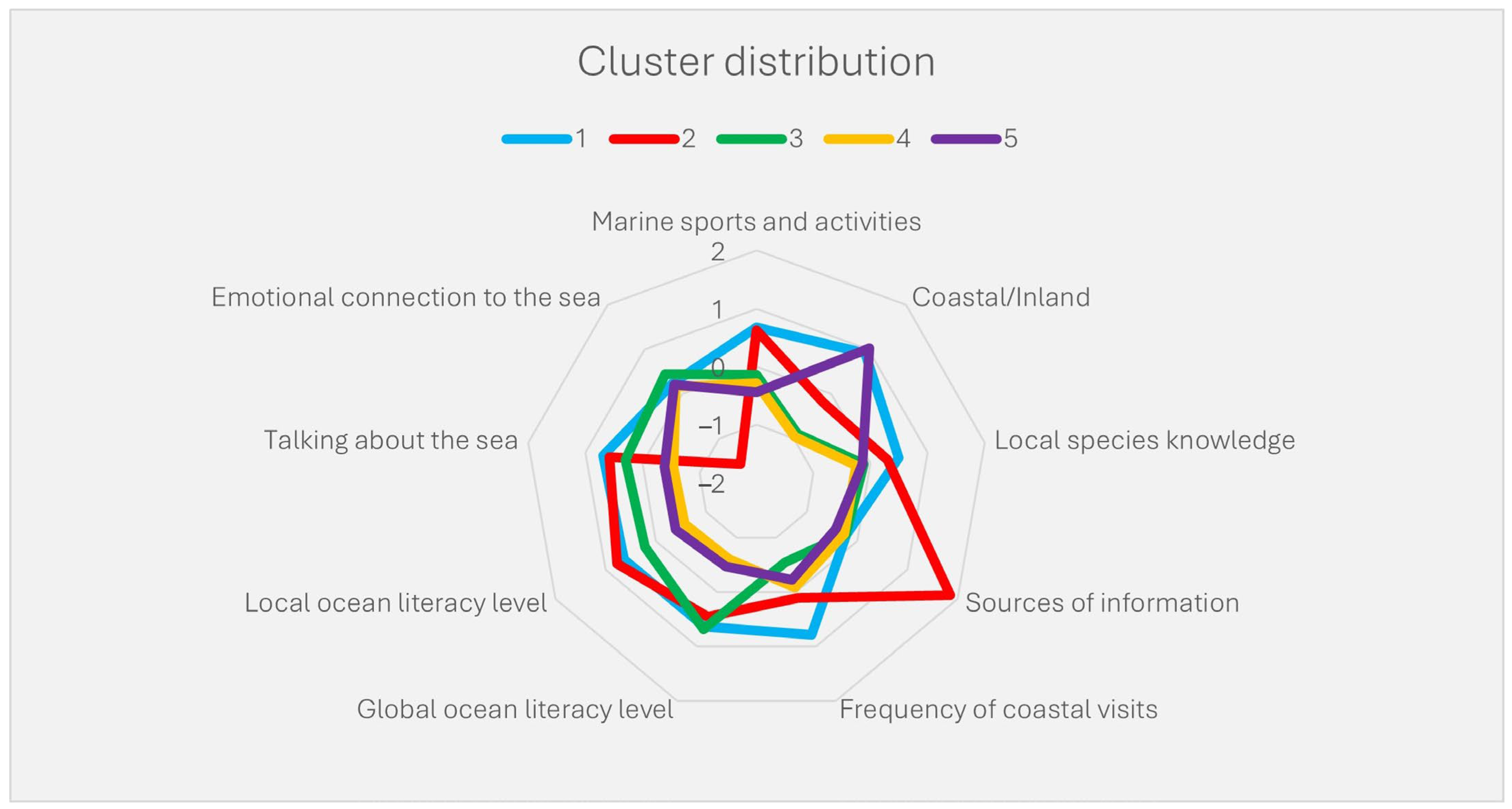 - Cluster 5—Passive Coastal Residents: This group perceives their municipality as coastal (1.03) but shows low levels of marine activity and knowledge. Their participation in marine sports is low (−0.44), sea visits are infrequent (−0.22), and they show limited global (−0.45) and local (−0.39) OL. They rarely discuss marine topics (−0.38), use few information sources (−0.41), and their emotional connection is only slightly positive (0.20). Their perceived coastal identity is not reflected in active engagement.