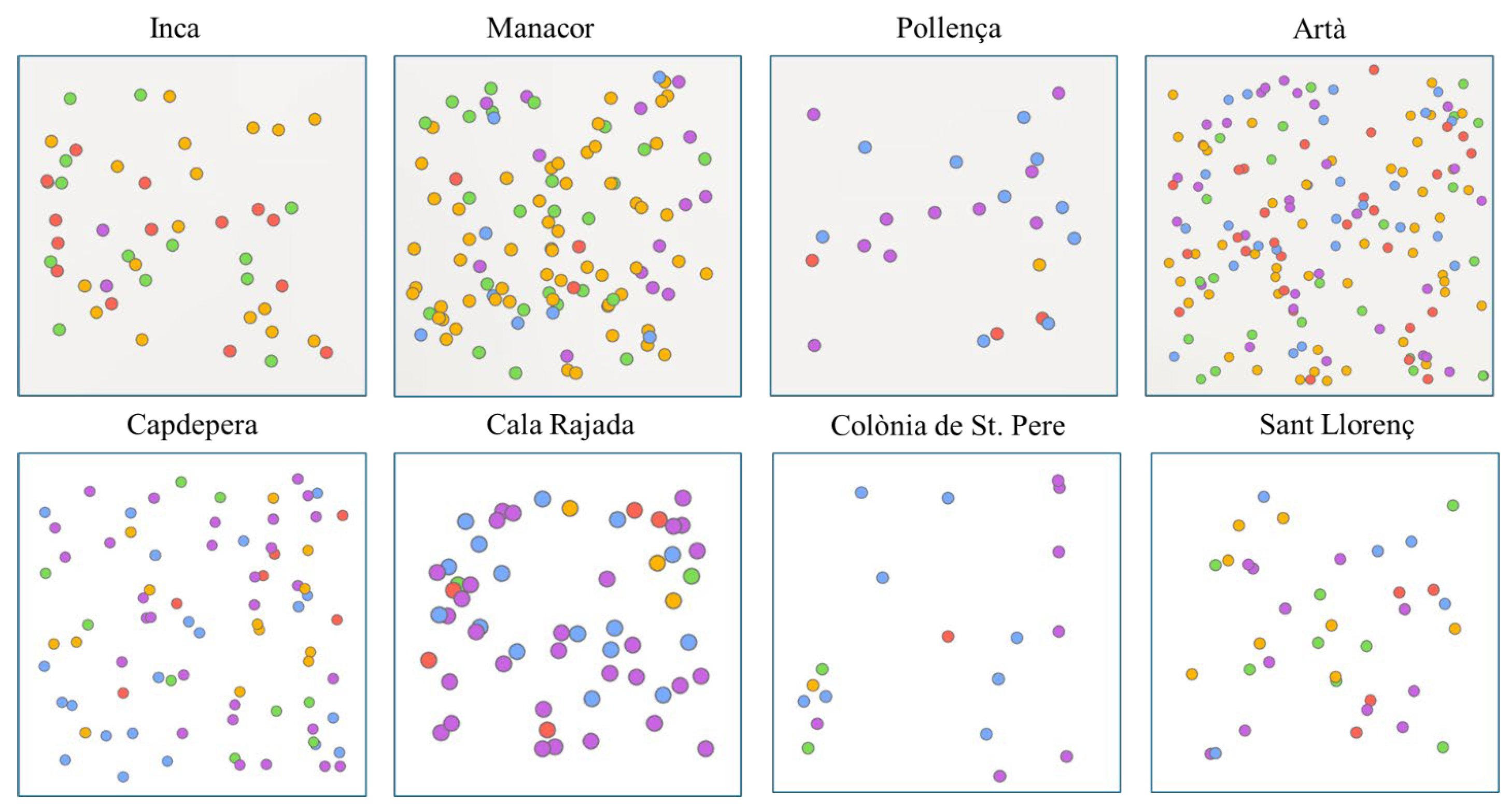 - Pollença stands out as the clearest example of active coastal engagement, with most students falling into Cluster 1 (Connected Coastal Engagers) and Cluster 5 (Passive Coastal Residents). This distribution reflects a population that predominantly identifies as coastal, where a significant portion not only lives near the sea but also integrates marine experiences, sports, and knowledge into their identity. The presence of Cluster 5 suggests that while coastal identity is strong, it does not always translate into active participation. A similar duality appears in Cala Rajada, Capdepera, and Colònia de Sant Pere. These municipalities show a dominant presence of Cluster 5, indicating students who perceive themselves as coastal but lack strong emotional connection, knowledge, or regular engagement with the sea. Cluster 1 also appears in each of these locations, though to a lesser extent than in Pollença, suggesting that while some students are actively involved, the broader trend is one of passive affiliation with the marine environment. This pattern points to a coastal but disengaged identity, where proximity to the sea does not necessarily foster deeper involvement.