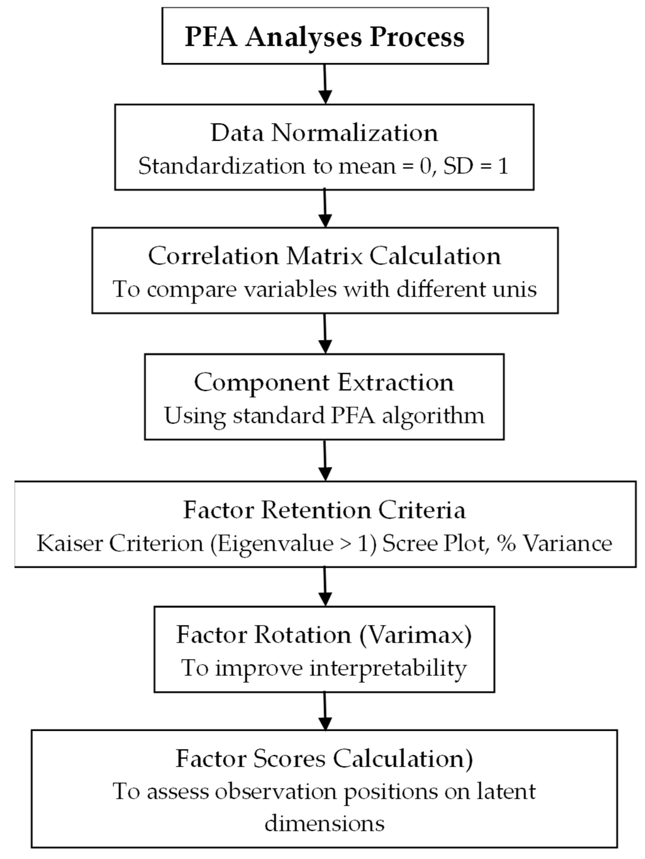 Six main factors (F1–F6) were retained, which, according to the previous analysis, explain a significant proportion of the total variance in the data. These six factors were named and interpreted as follows: