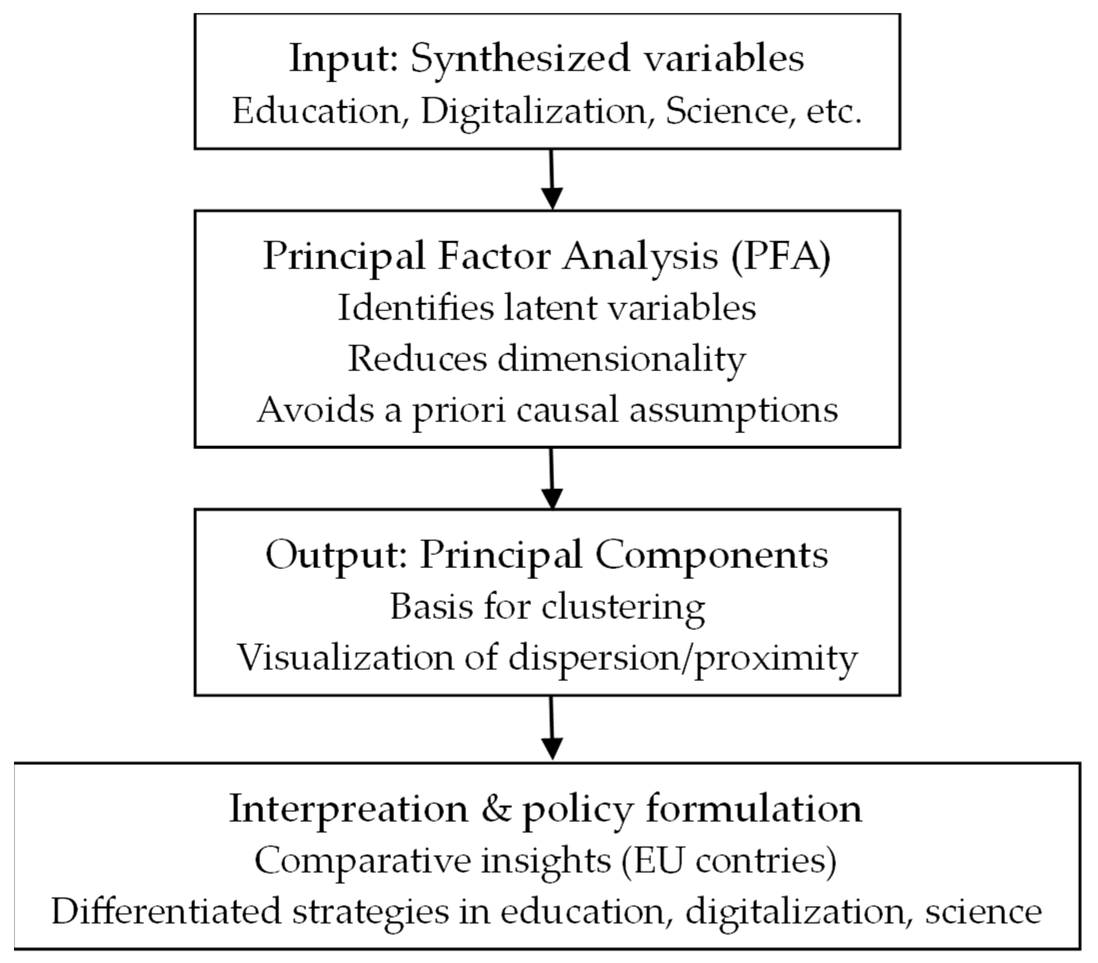 The PFA demonstrated that innovation and economic development are multidimensional phenomena, effectively captured by the six extracted factors. These factors provide an essential analytical framework for making cross-national comparisons and longitudinal monitoring of progress, identifying the specific strengths and vulnerabilities of each national innovation system, and informing public policy strategies; thus, more targeted interventions can be facilitated, stimulating growth on deficit dimensions and consolidating existing advantages.