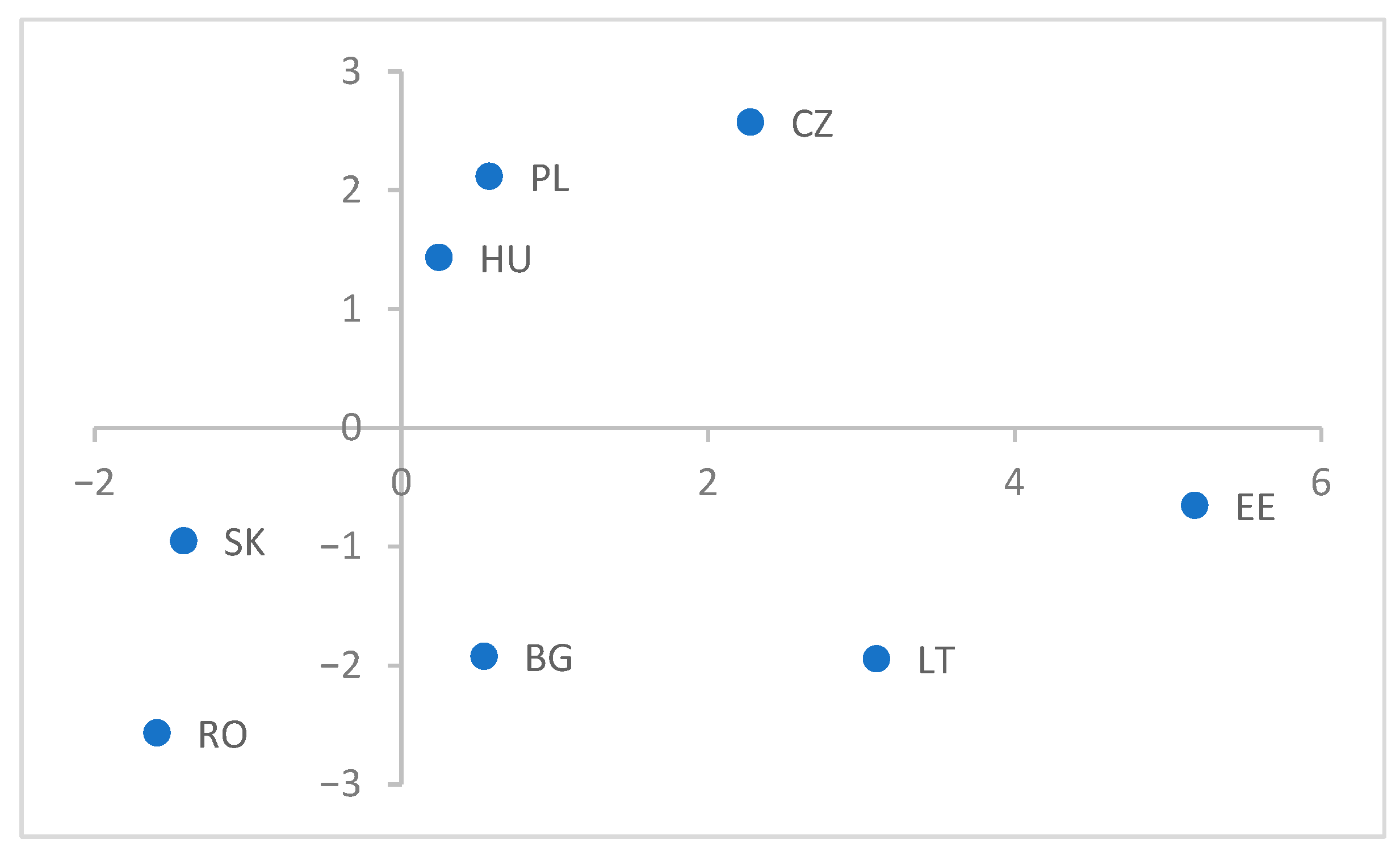 Figure 3, presents consolidated innovation and digitalization profiles, with countries located in this quadrant showing positive scores on both Factor 1 and Factor 2, indicating a high level of performance in the areas of research innovation and digitalization (CZ, PL and HU). CZ (F1: 2.28, F2: 2.57) shows a balance between investments in education and research, innovation capacity (measured by indicators such as patents and university–industry collaboration), and international openness (student mobility and international research connections). PL (F1: 0.57 and F2: 2.12) displays an average performance in innovation (F1), but a good score in collaboration and innovation system (F2), having a functional institutional network, with potential for increasing research investments. HU (F1: 0.24 and F2: 1.43) is also in this quadrant, suggesting a convergence towards a knowledge-based development model, with a growing institutional network, but a modest level of direct investment in knowledge. Countries in this quadrant demonstrate the capacity to support an innovative ecosystem that benefits from solid investments in research and development, effective collaboration between universities and industry, openness to academic mobility and internationalization, and the integration of information technologies into institutional systems. These characteristics give them a competitive advantage in the transition to a knowledge-based and technology-based economy.