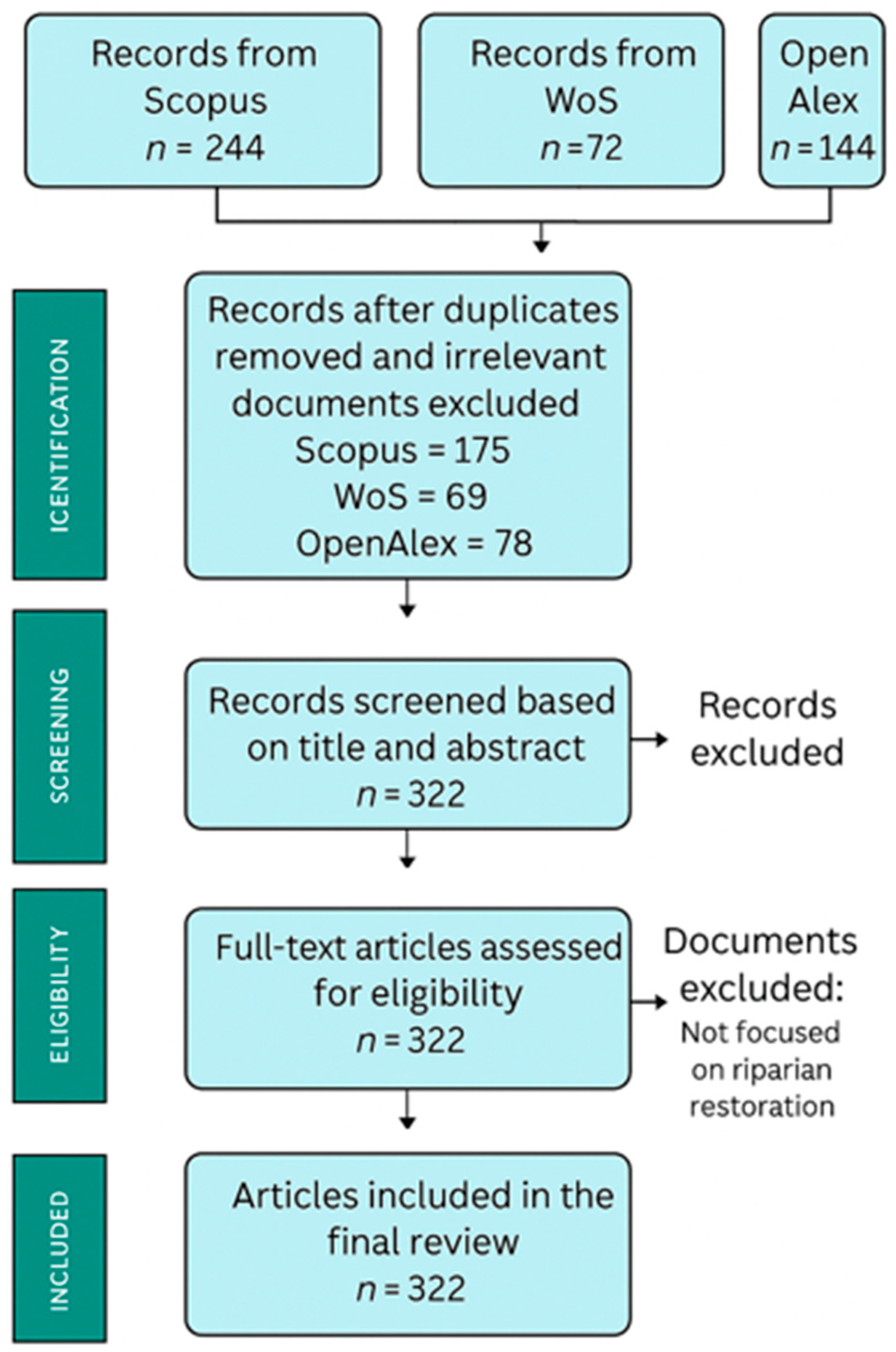 - Qualitative content analysis: Applied to the 322 articles to classify and describe the main perspectives in riparian ecosystem restoration (Table S3). The classification framework integrates established models and guidelines on ecological restoration, ecosystem services, community participation, and riparian management, selected for their international relevance and operational clarity.