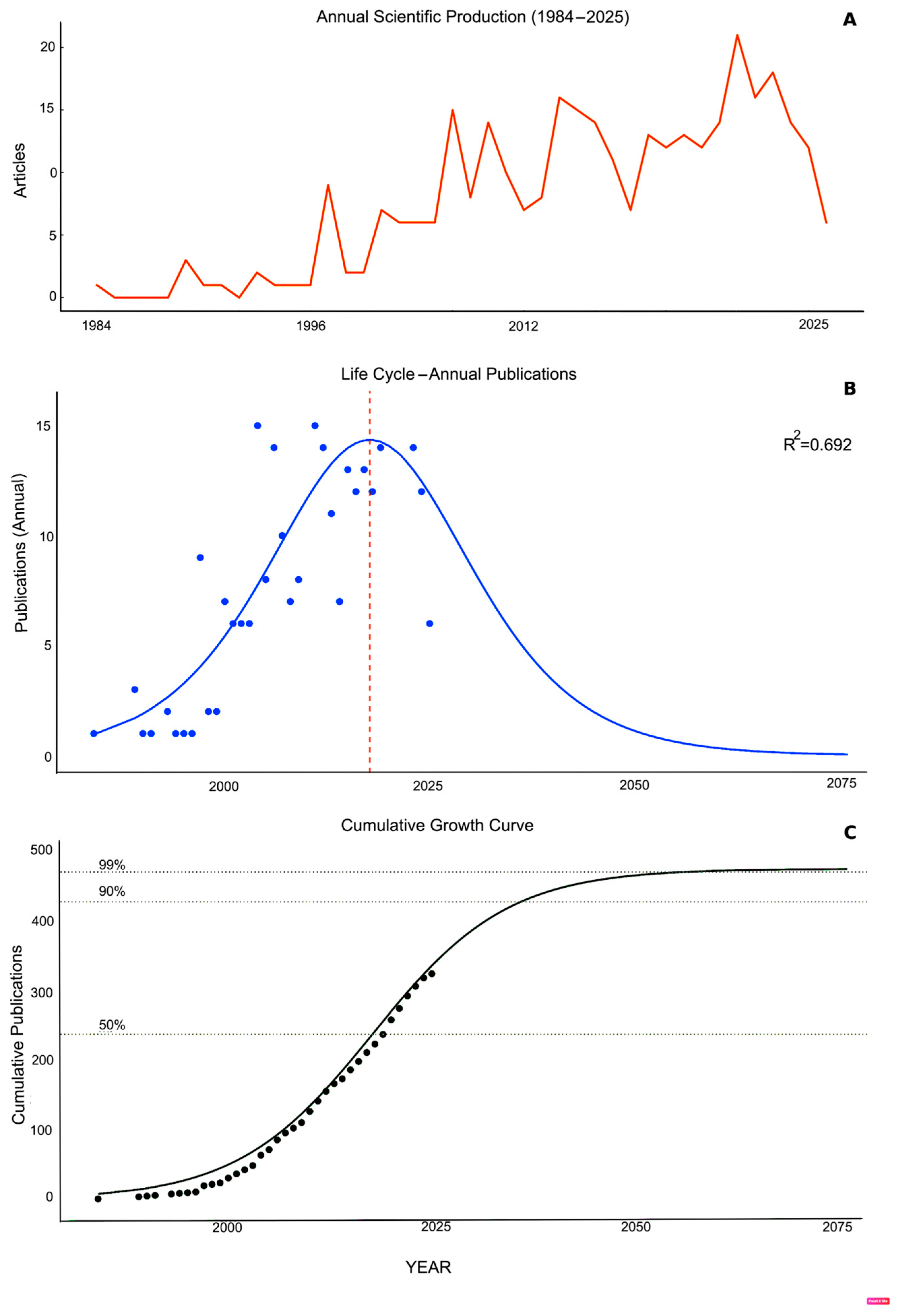 - Evolution of scientific production: publication counts and annual growth [34].
