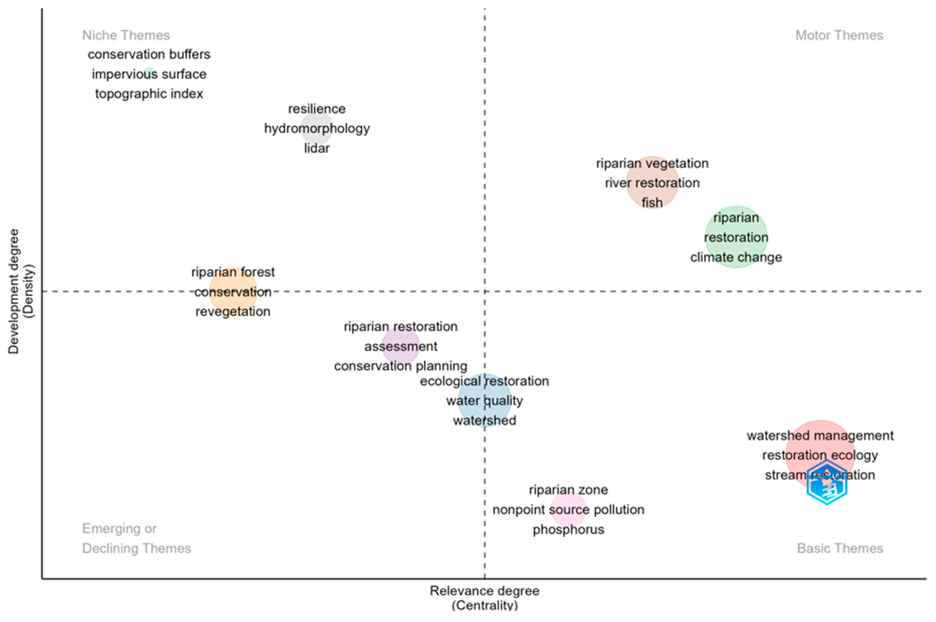 - Zheng, J.; Wang, L.; Li, C. Trends and Hotspots in Riparian Restoration Research: A Global Bibliometric Analysis during 1990–2022. Forests 2024, 14, 2205. [Google Scholar] [CrossRef]