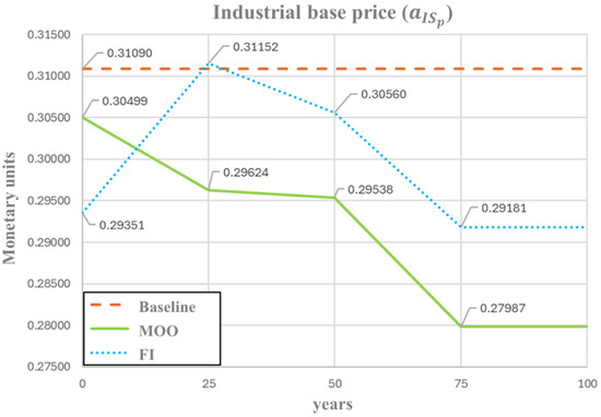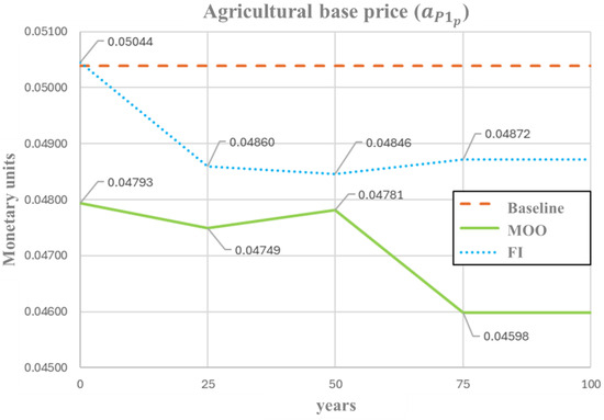 Optimal profile of agricultural base price () under FI and MOO approaches.