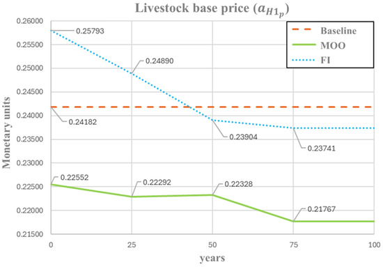 Optimal profile of livestock base price () under FI and MOO approaches.