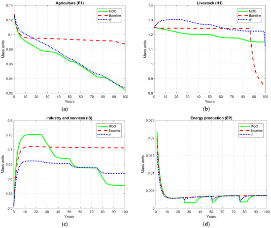 At the sectoral level, the apparent decline in agricultural (P1) and industrial (IS) output under both optimization frameworks does not represent economic contraction; rather, it reflects the structural rebalancing toward more-efficient and less-resource-intensive production patterns. The FI approach reduces oscillations and stabilizes production through conservative energy allocation, while MOO lowers production intensity in the short term to prevent overexploitation and to sustain long-term system viability. This mirrors empirical evidence showing that effective climate policies combine price-based instruments (e.g., carbon taxes) with regulatory or innovation-oriented measures that promote efficiency-oriented adjustments rather than output expansion [51,52].