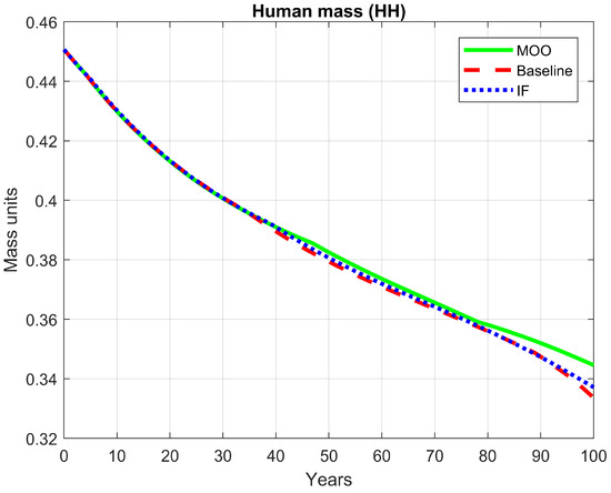 Figure 3 shows the temporal evolution of the mortality rate of wild plants accessible to humans () over a 100-year simulation horizon. The FI-based optimization exhibits a gradual decline in m_P2 from 0.1977 to 0.1933, corresponding to a 2.2% reduction relative to the baseline. This pattern suggests a progressive regulation of semi-managed vegetation, maintaining values close to current conditions while promoting long-term ecological stability. In contrast, the MOO displays an opposite trend, starting from a lower initial value (0.1779), approximately 10% below the baseline, and gradually increasing to 0.1826 toward the end of the simulation. This behavior indicates that the MOO framework emphasizes early corrective interventions followed by gradual relaxation, consistent with its objective of balancing short-term ecological improvement with long-term system stability.