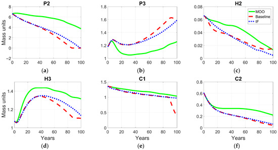 Figure 5 shows the temporal profiles of the base prices of agricultural plants () throughout the 100-year simulation period. The FI-based optimization begins at the same initial value as the baseline model (0.0504), then exhibits a decrease, stabilizing around 0.0485. This pattern indicates that the FI approach promotes a moderate reduction in and strict control of agricultural prices, consistent with stabilization of resource flows and production efficiency within the system. In contrast, the MOO starts from a lower initial price (0.0479), approximately 5% below the baseline, fluctuating every 25 years with minor oscillations, yet consistently remaining below the values obtained in the FI and baseline models. This adaptive fluctuation pattern indicates that the MOO framework offers more flexible control, allowing for periodic corrections in agricultural pricing to maintain equilibrium among the economic, social, and environmental dimensions.