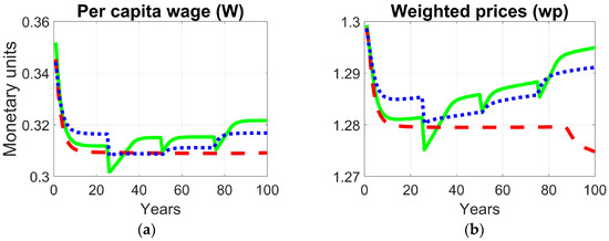 Comparative trajectories of socio-economic indicators under different optimization frameworks: (a) per capita wages (W); (b) weighted prices.