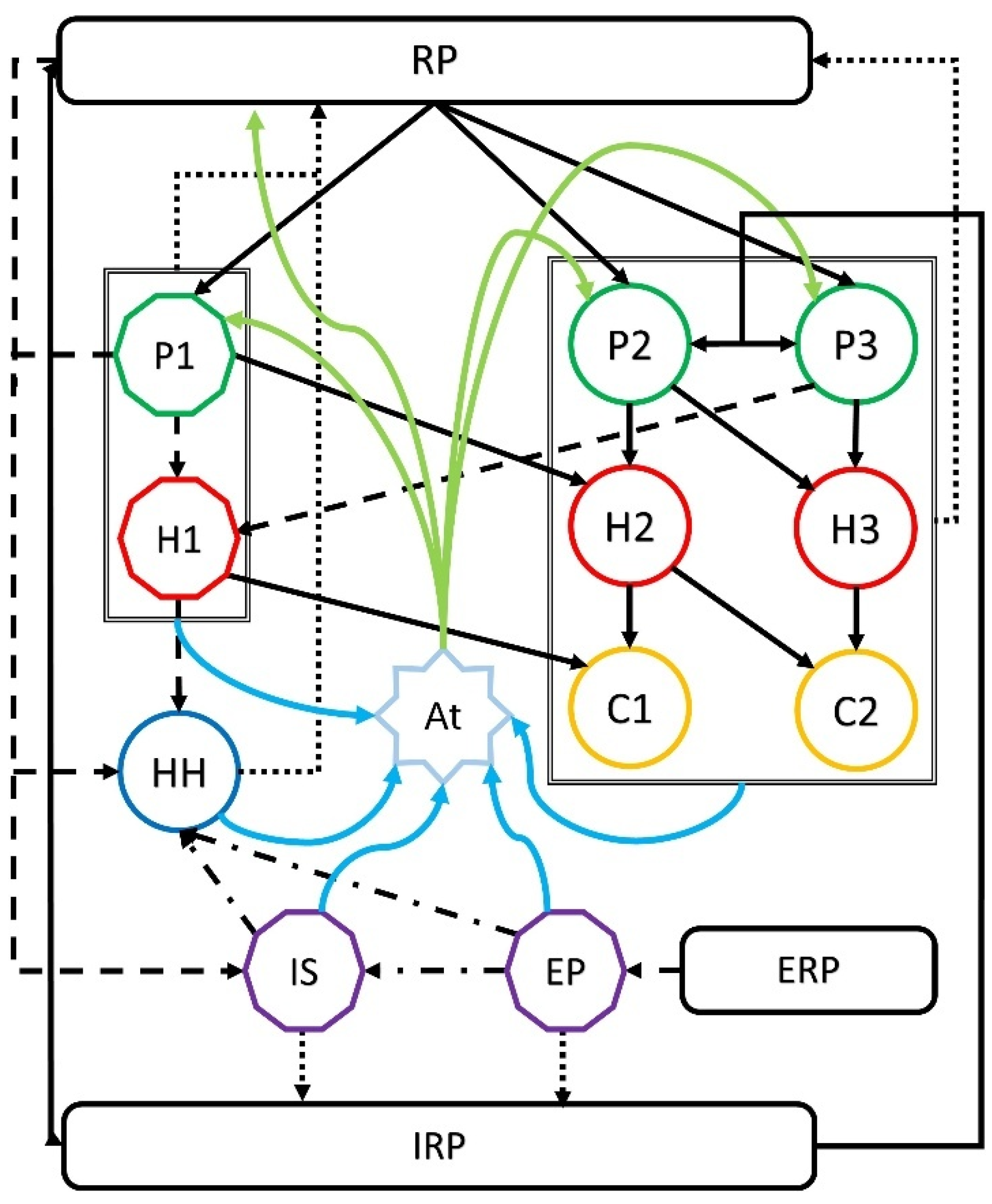 - Resource Pools: RP (biotic/abiotic finite resources), ERP (finite energy resources), IRP (biologically inaccessible mass; waste/sinks).