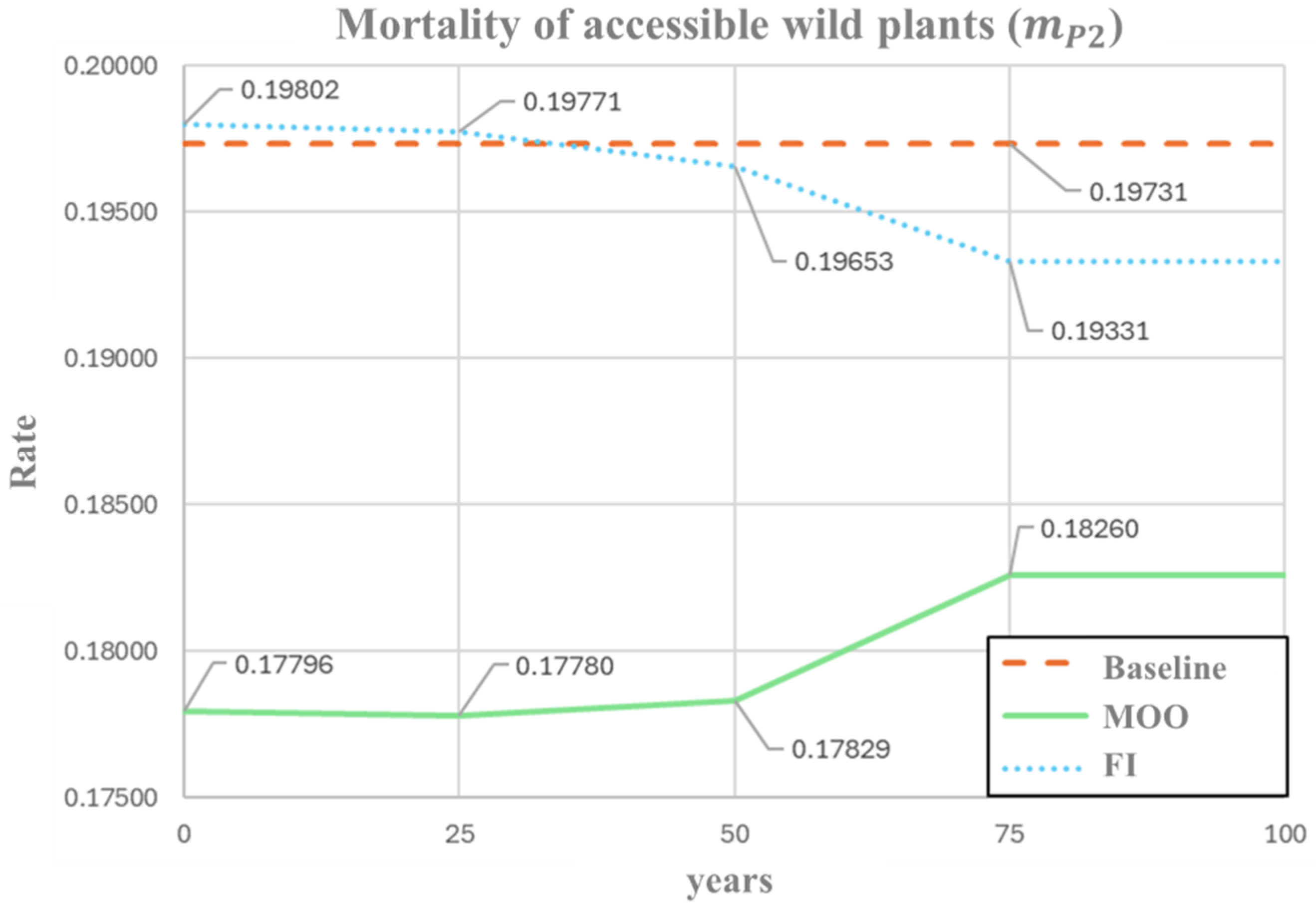 - Mortality of wild plants accessible to humans (): This variable reflects the level of pressure exerted on semi-managed forest resources. At the policy level, it can be influenced through forest management policies, such as regulations on harvesting intensity, conservation programs, or reforestation incentives.